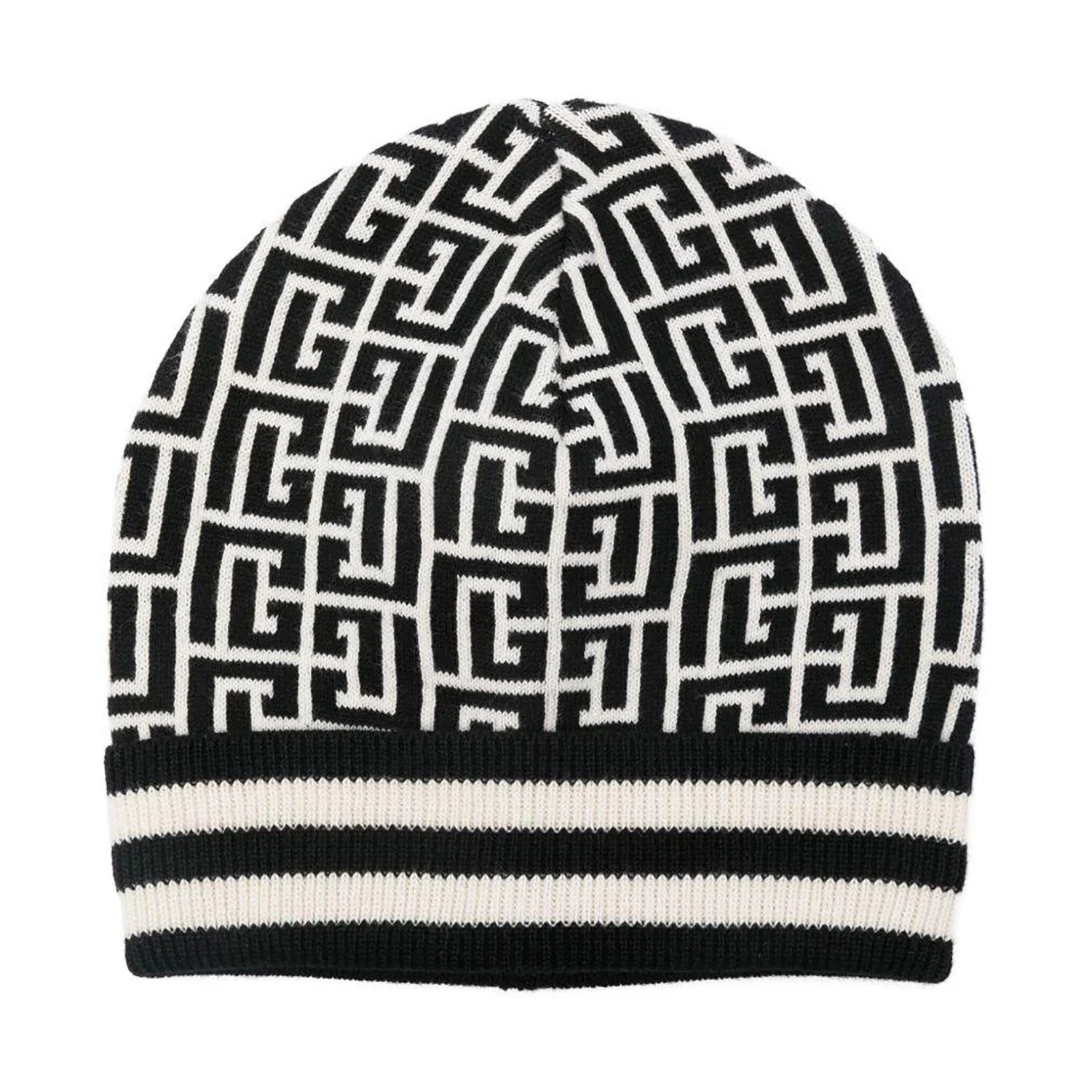 131€Balmain Paris ivory/black knitted cap made of cotton and wool blend, featuring jacquard labyrinth pattern. -