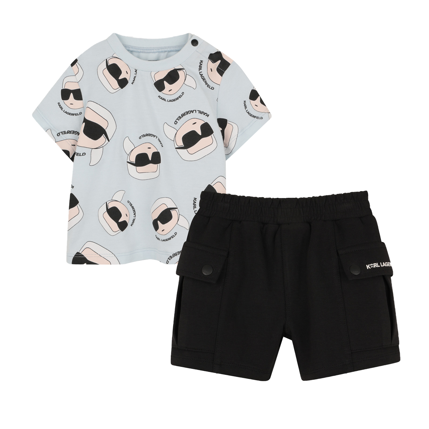 99€Karl Lagerfeld sky blue-black organic cotton set. It features a sky blue t-shirt with Karl figures printed and black cargo style shorts with a striped… -