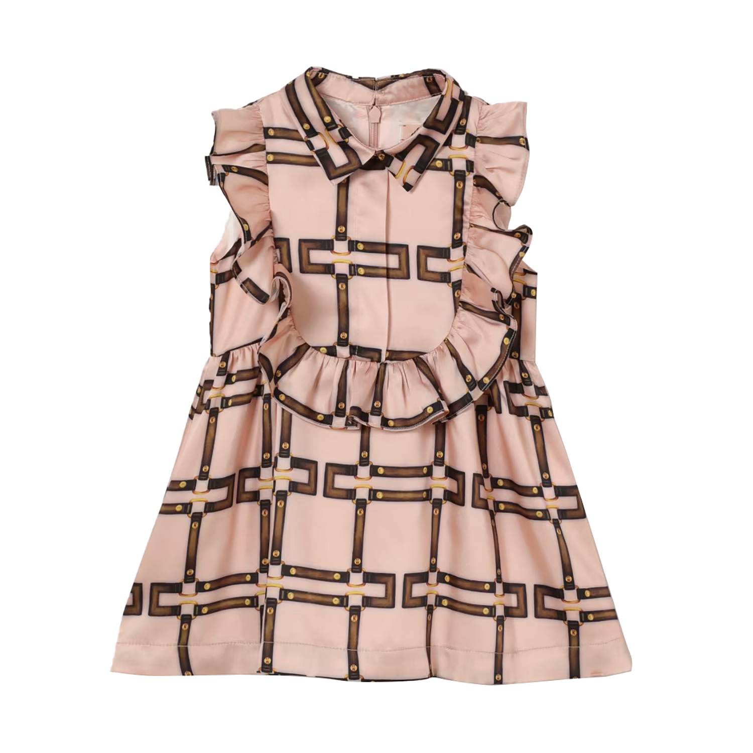Elisabetta Franchiροζ dusty ματ σατέν φόρεμα με σχέδιο λογότυπου αλυσίδα. Έχει βολάν και διακριτικό φερμουάρ στο πίσω μέρος.