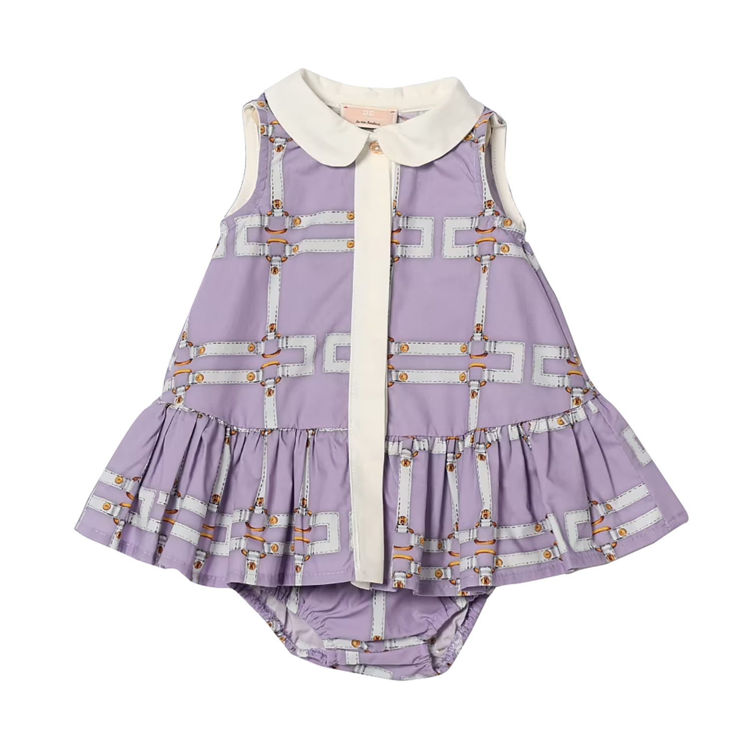 Elisabetta Franchi ανοιχτό μωβ βαμβακερό φόρεμα ποπλίνα, με τυπωμένα λογότυπα αλυσίδα, ασορτί εσώρουχο και κρυφό κούμπωμα με κουμπιά.