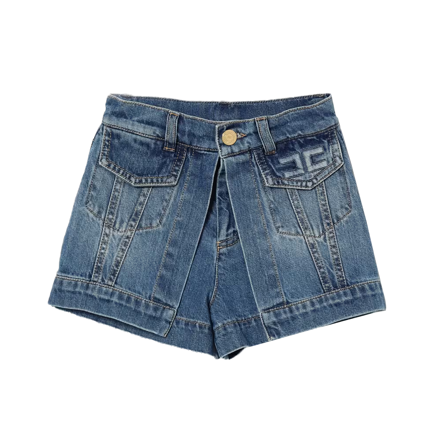 248€Elisabetta Franchi ελαστικό βαμβακερό τζιν σορτς με στυλ φούστας, σχέδιο πιέτας στο κέντρο, 3D λογότυπο και χρυσό κούμπωμα με λογότυπο. -