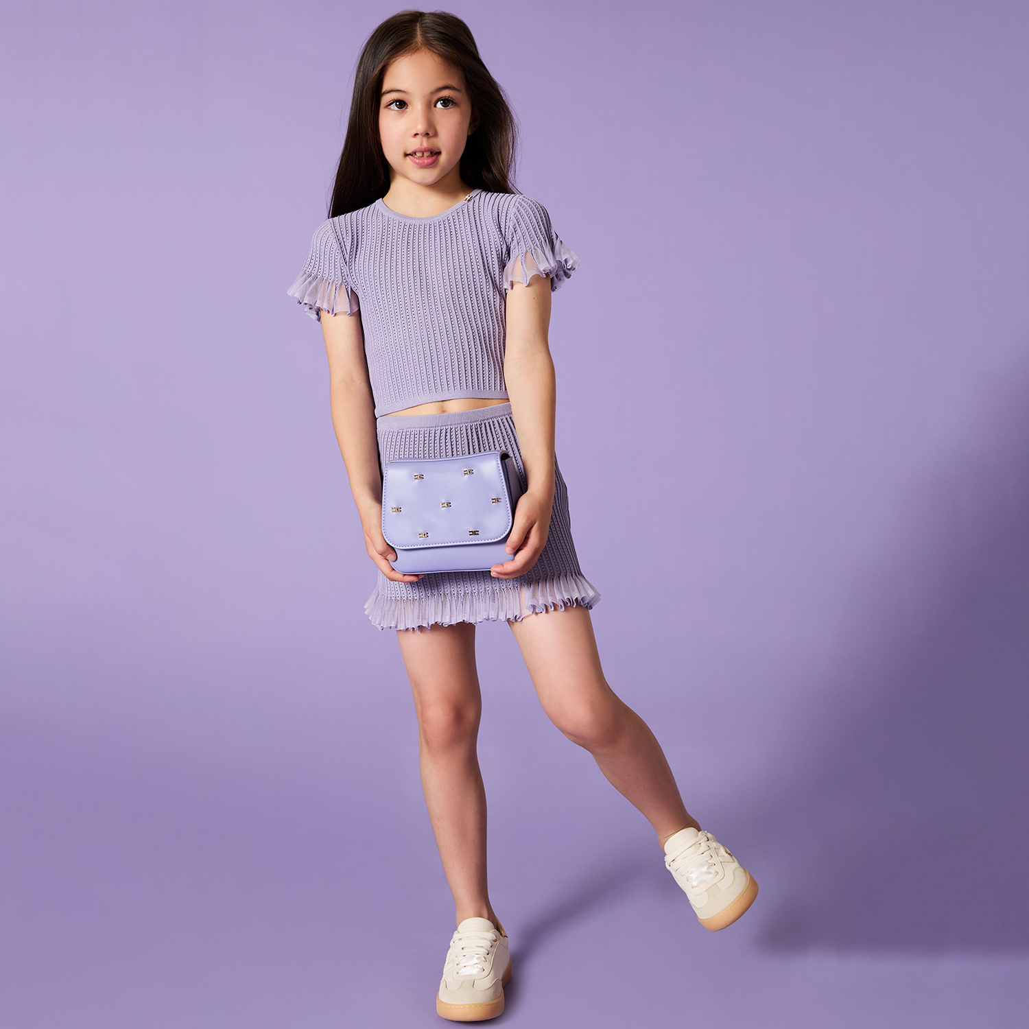 338€Elisabetta Franchi μωβ πλεκτό σετ βισκόζης με πολύ απαλή και ελαστική-άνετη εφαρμογή. Διαθέτει πλισέ λεπτομέρειες με βολάν στα μανίκια και στο στρίφωμα της φούστας. -