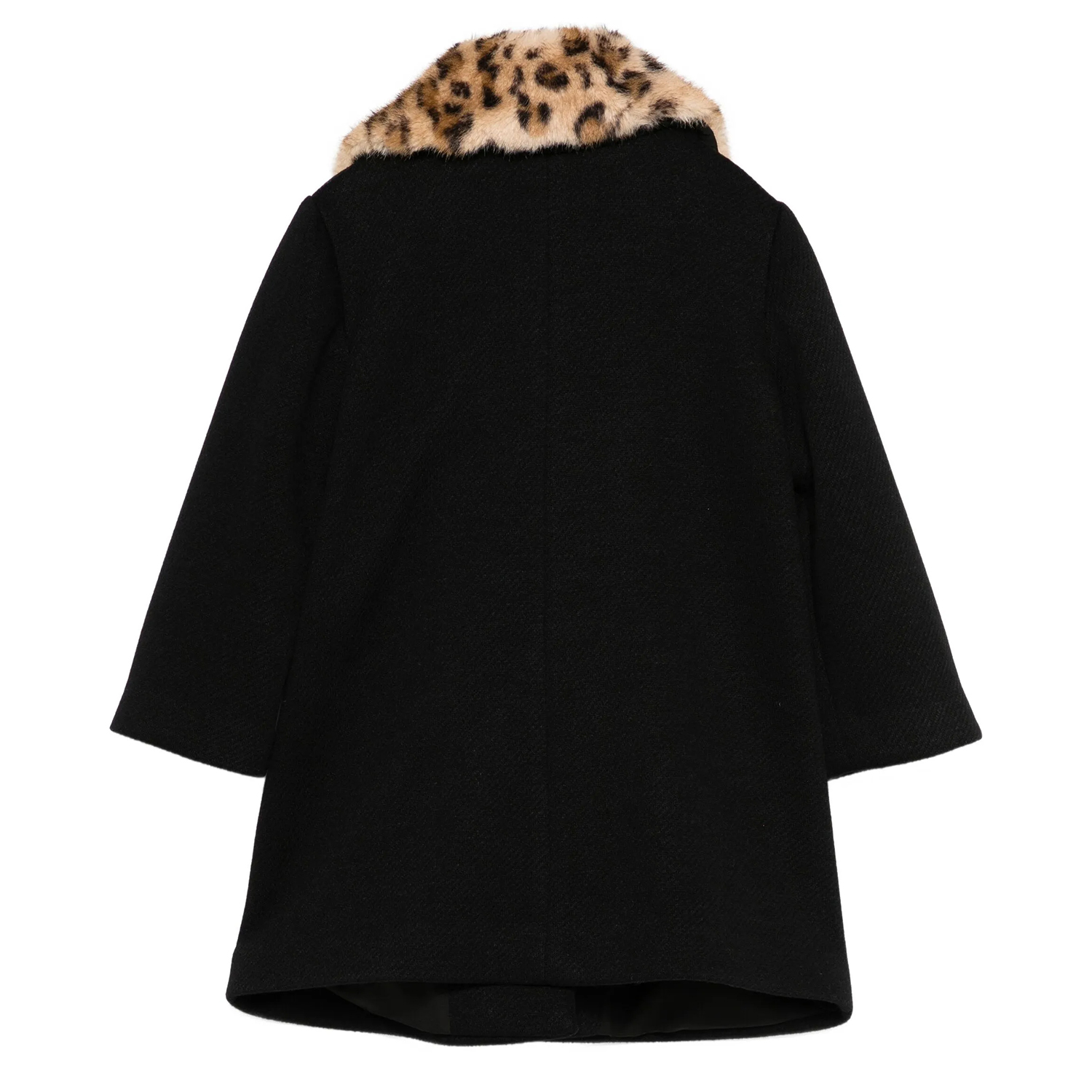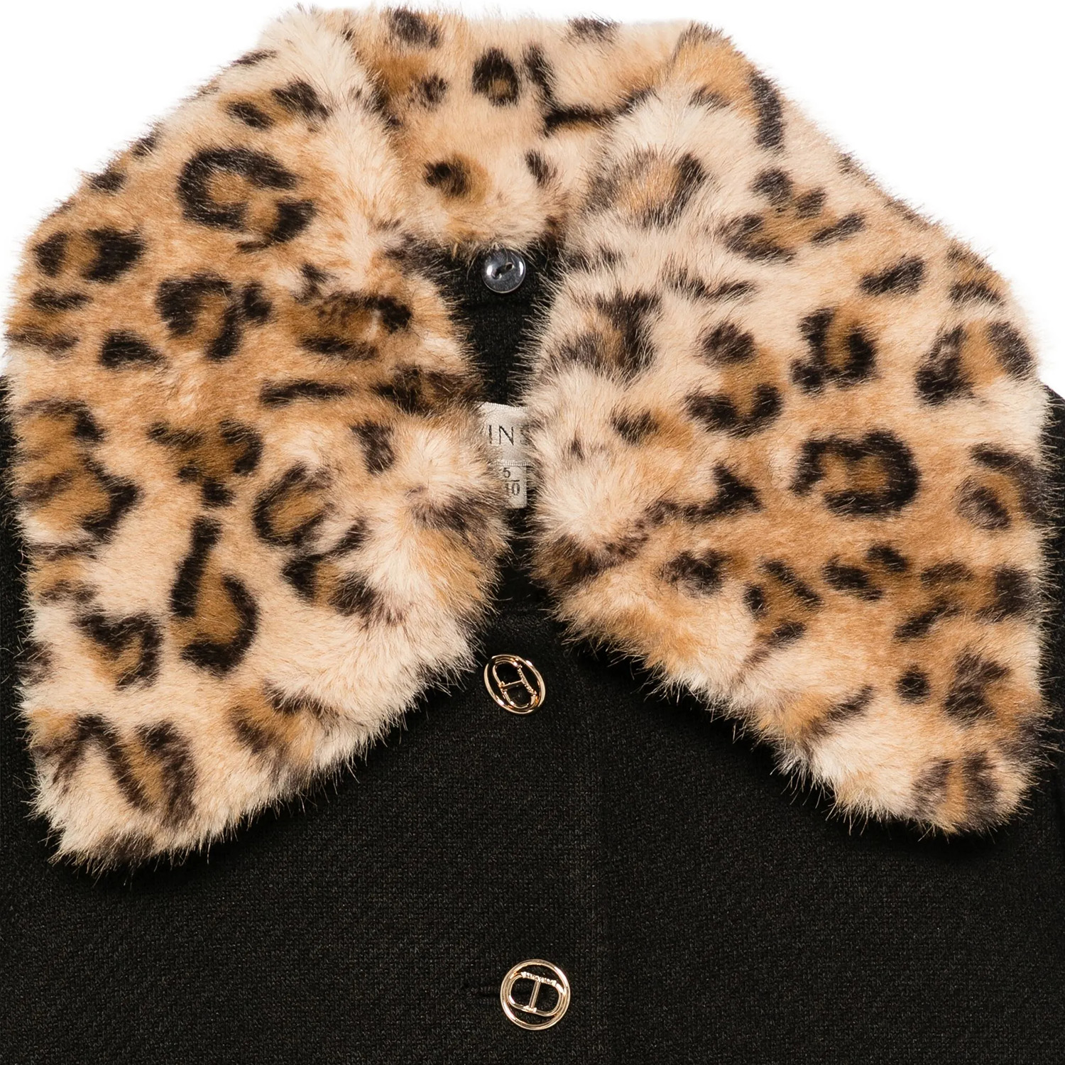 Twinset μαύρο παλτό με μια αφαιρούμενη animal-print εφαρμογή από οικολογική γούνα. Διαθέτει χρύσα κουμπιά με λογότυπο και απαλή φόδρα στο εσωτερικό.