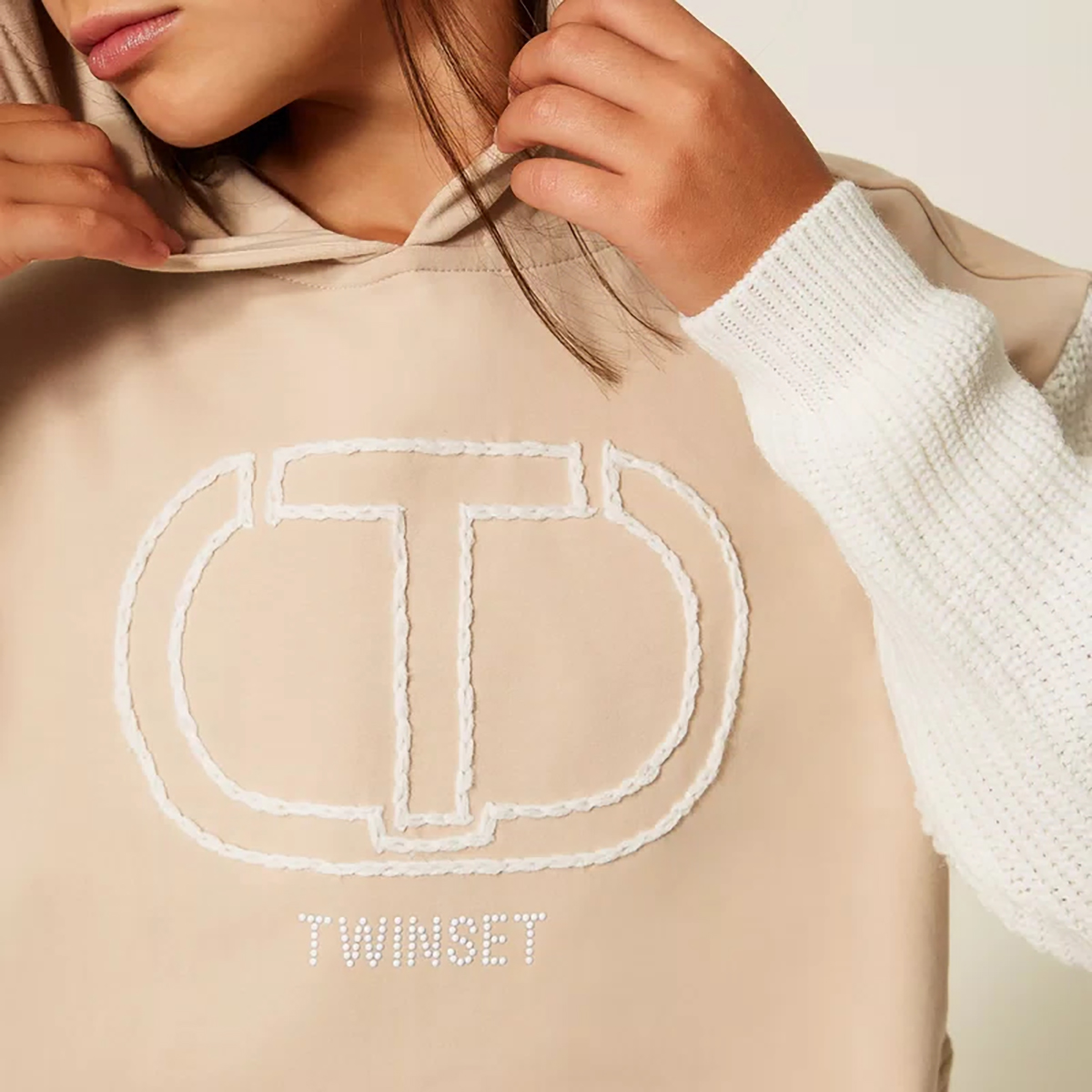 Twinset ανοιχτό μπεζ βαμβακερό σετ φόρμας με το φούτερ να έχει πλεκτά μανίκια, κουκούλα και λογότυπα και ένα ασορτί παντελόνι.