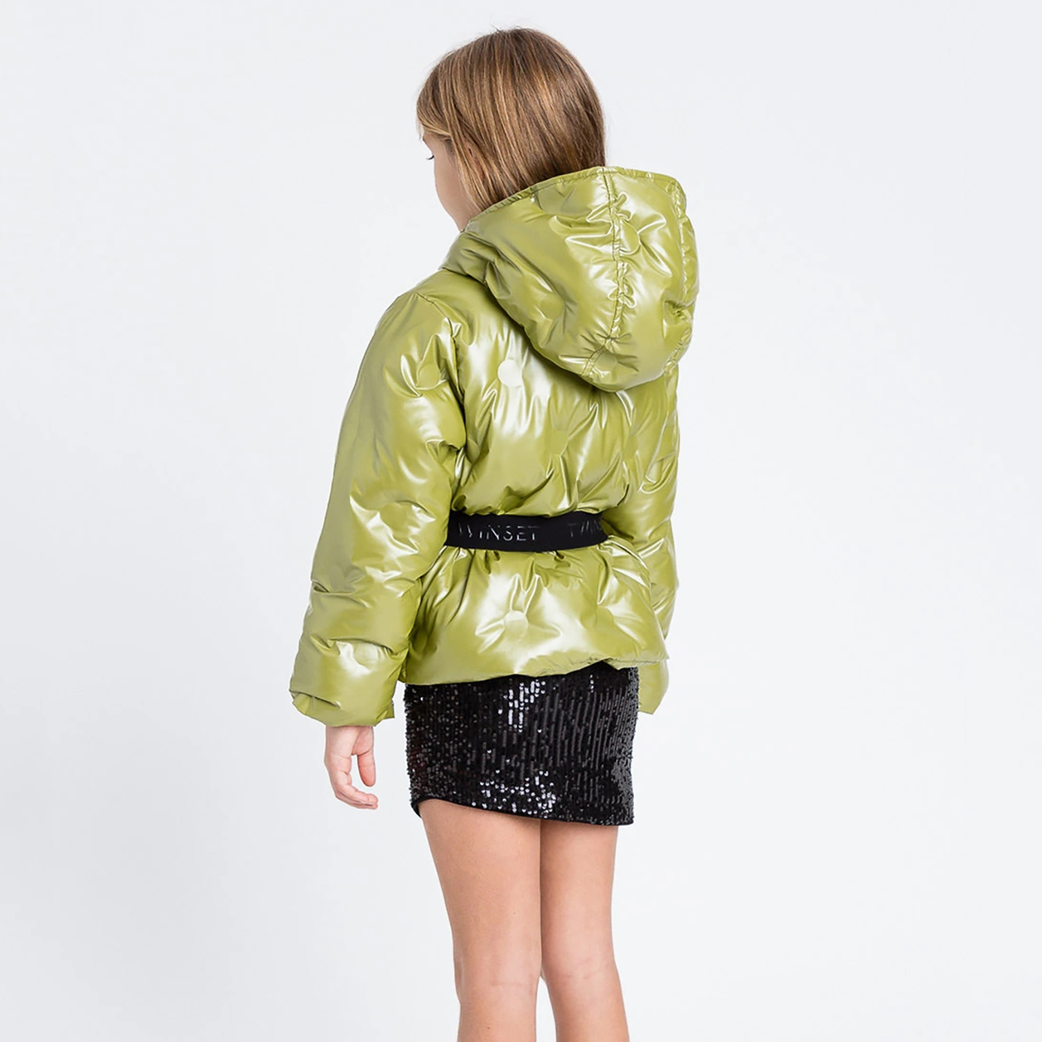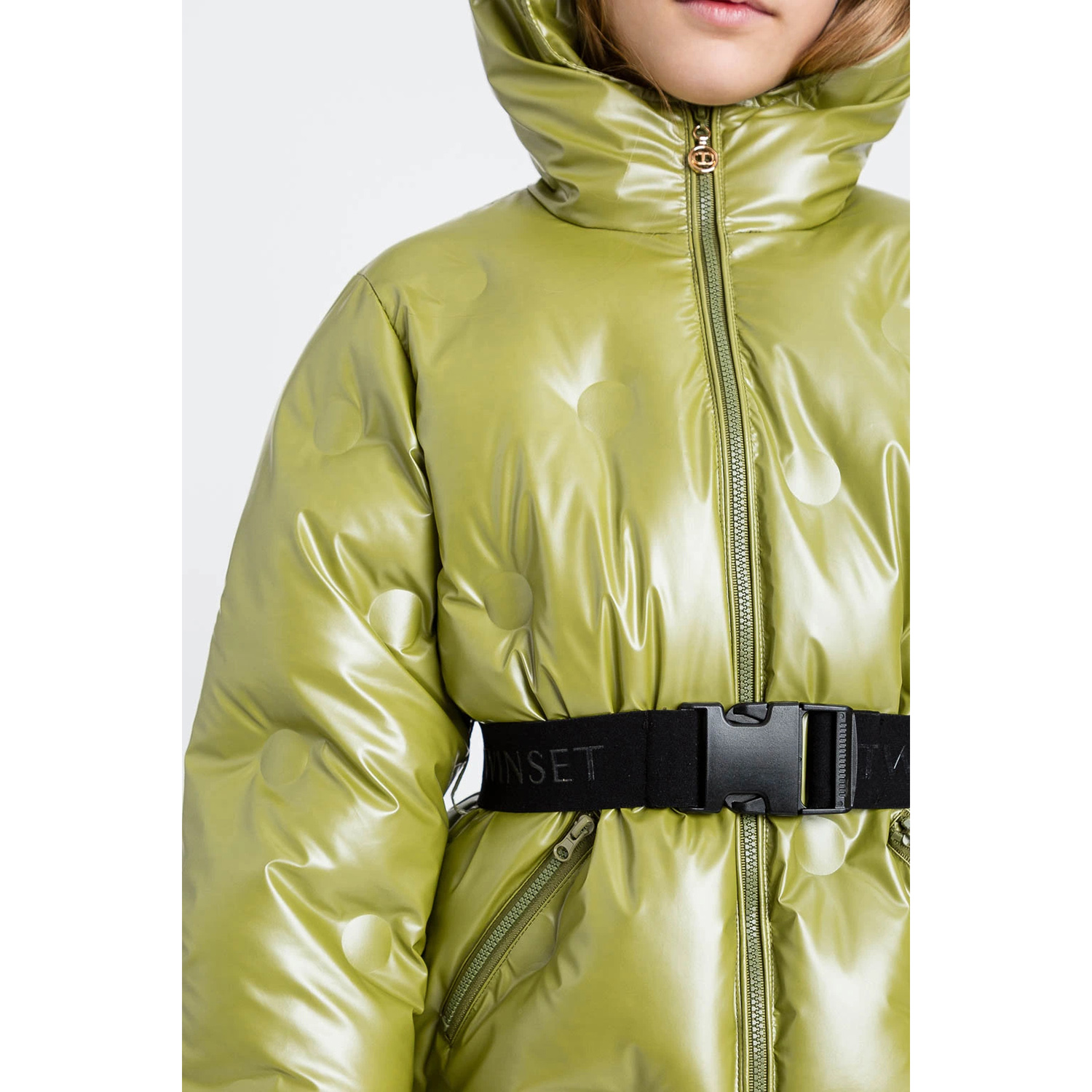 Twinset ημίμακρο puffer μπουφάν με κουκούλα σε λαδί χρώμα. Διαθέτει μοναδικό σχέδιο στην ύφανση με διακριτικά “πουά” σχέδια, αφαιρούμενη μαύρη ζώνη με λογότυπο και φερμουάρ σε χρυσό χρώμα.