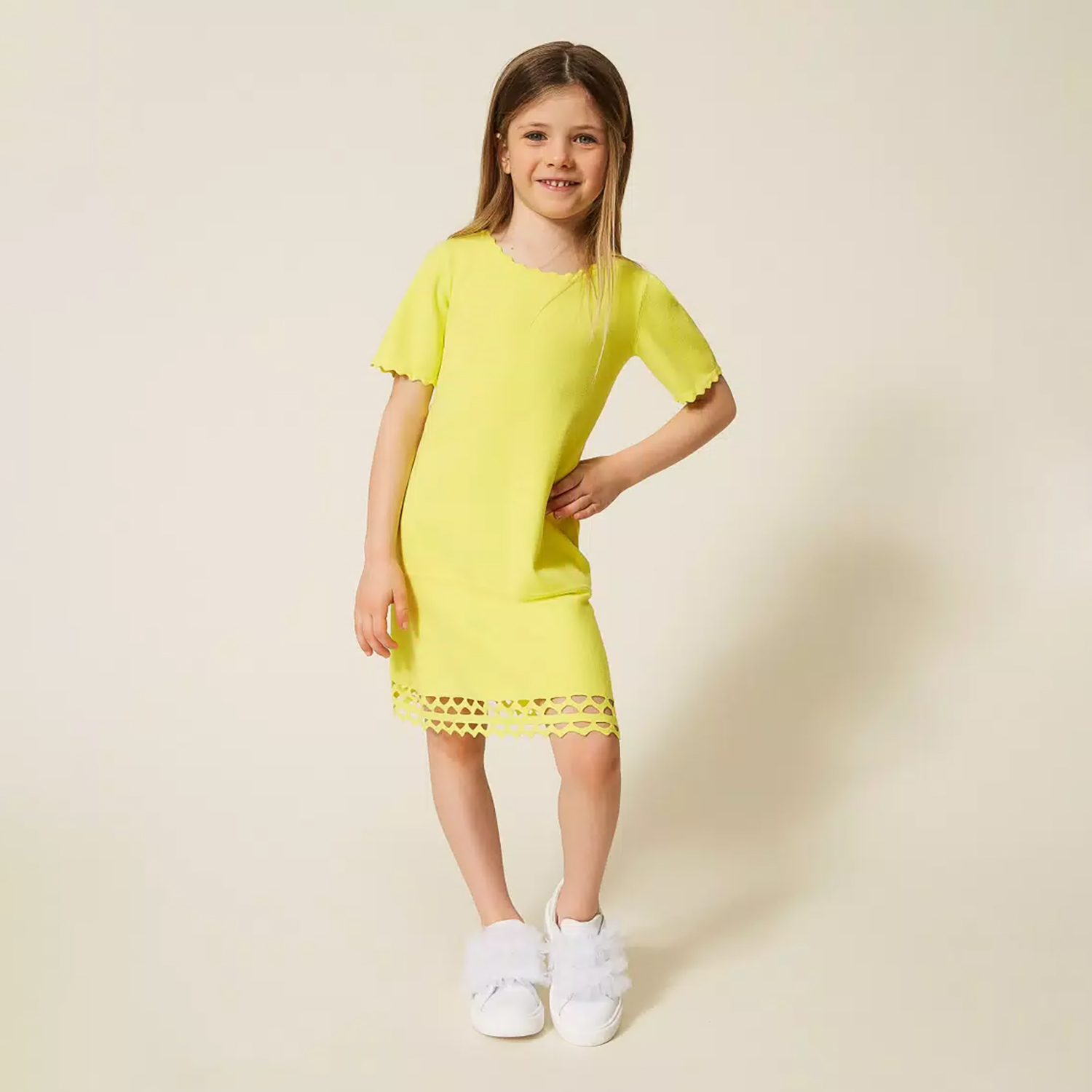 Twinset υπόλευκο βαμβακερό σετ μπλούζας και παντελόνας. Και τα δύο ενδύματα έχουν κεντημένες λεπτομέρειες από δαντέλα κιπούρ, η μπλούζα έχει κούμπωμα στο πίσω μέρος και το παντελόνι έχει λάστιχο στη μέση.