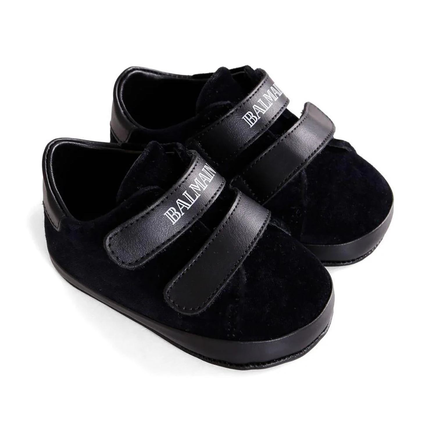 Balmain Paris μαύρο κοστούμι από παρθένο μαλλί (cool-wool) με χρυσά κουμπιά με λογότυπο. Περιλαμβάνει σακάκι, ασορτί παντελόνι και λευκό βαμβακερό πουκάμισο, όλα με μοτίβο ζακάρ λαβύρινθο. Εσωτερικά διαθέτουν απαλή φόδρα.
