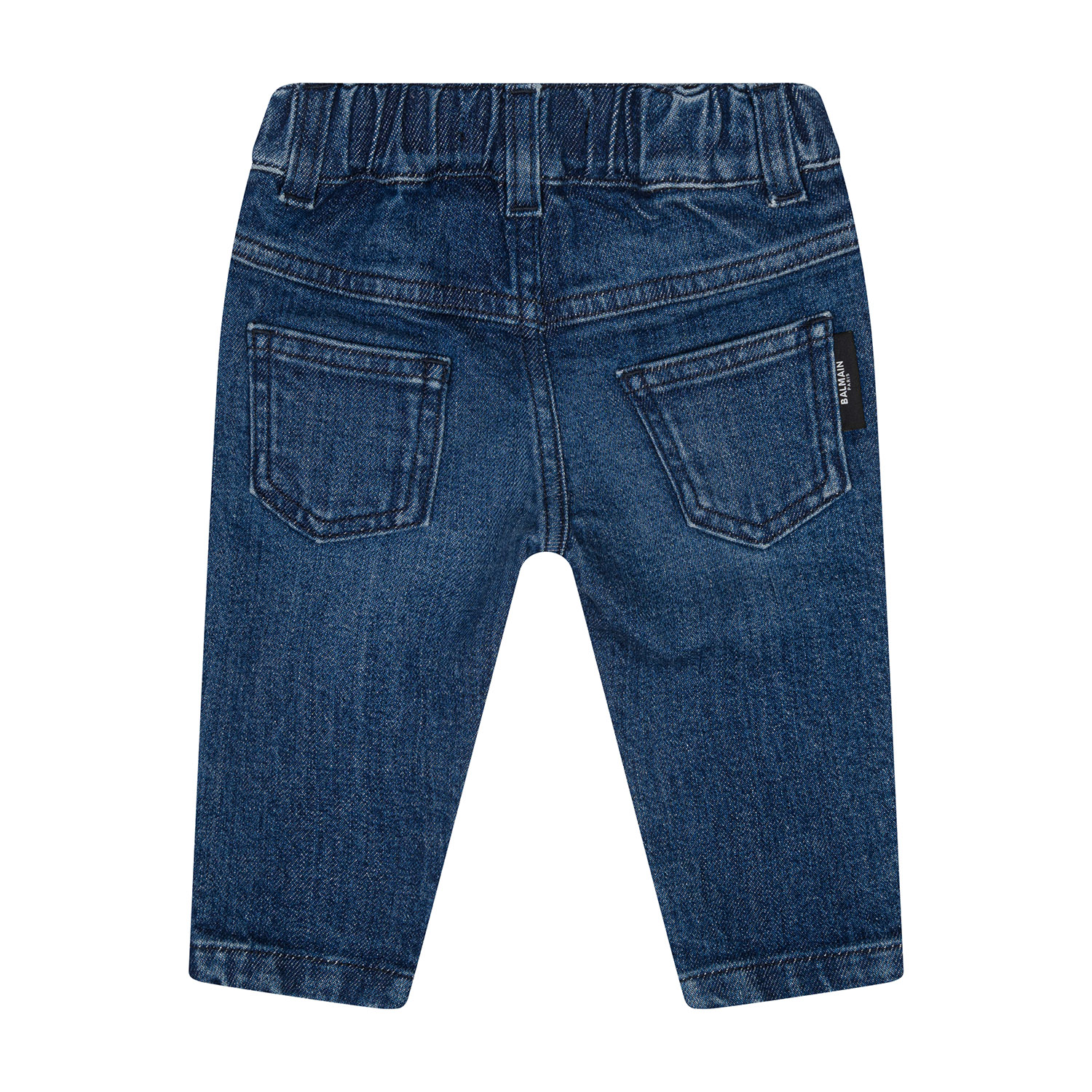 Balmain Paris μπλε τζιν βαμβακερό παντελόνι με λάστιχο στη μέση και ασημί κουμπί με λογότυπο.