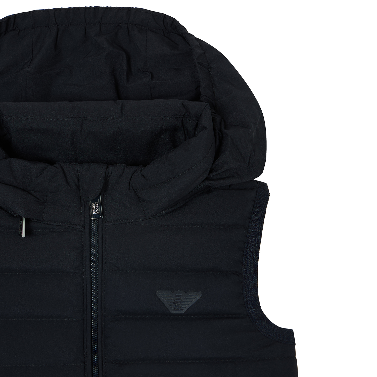 Emporio Armani λεπτό σκούρο μπλε γιλέκο με ματ επικάλυψη, ελαστικά ανοίγματα μασχάλης και μέση, και λογότυπο αετού tone-to-tone στο στήθος.