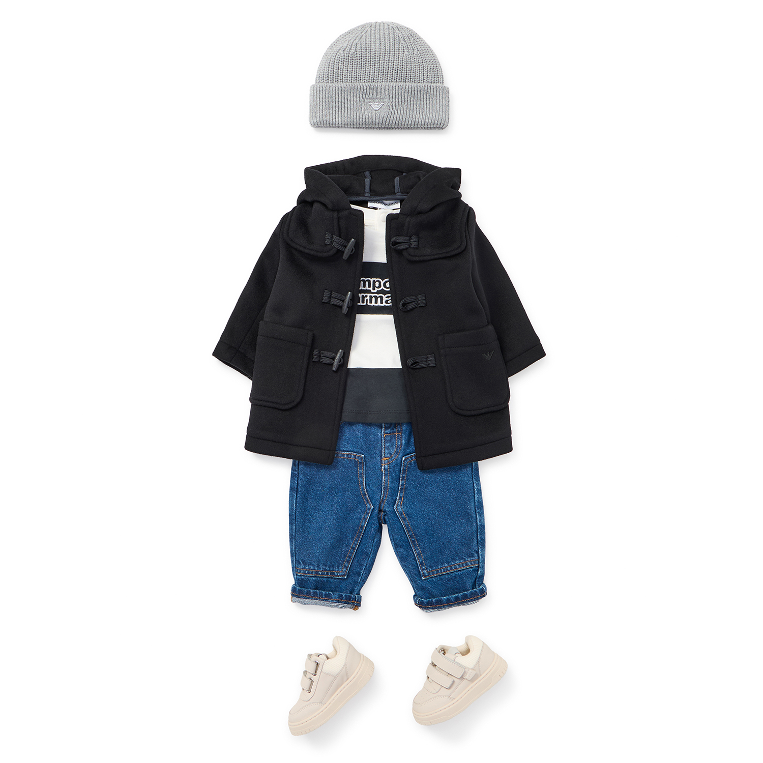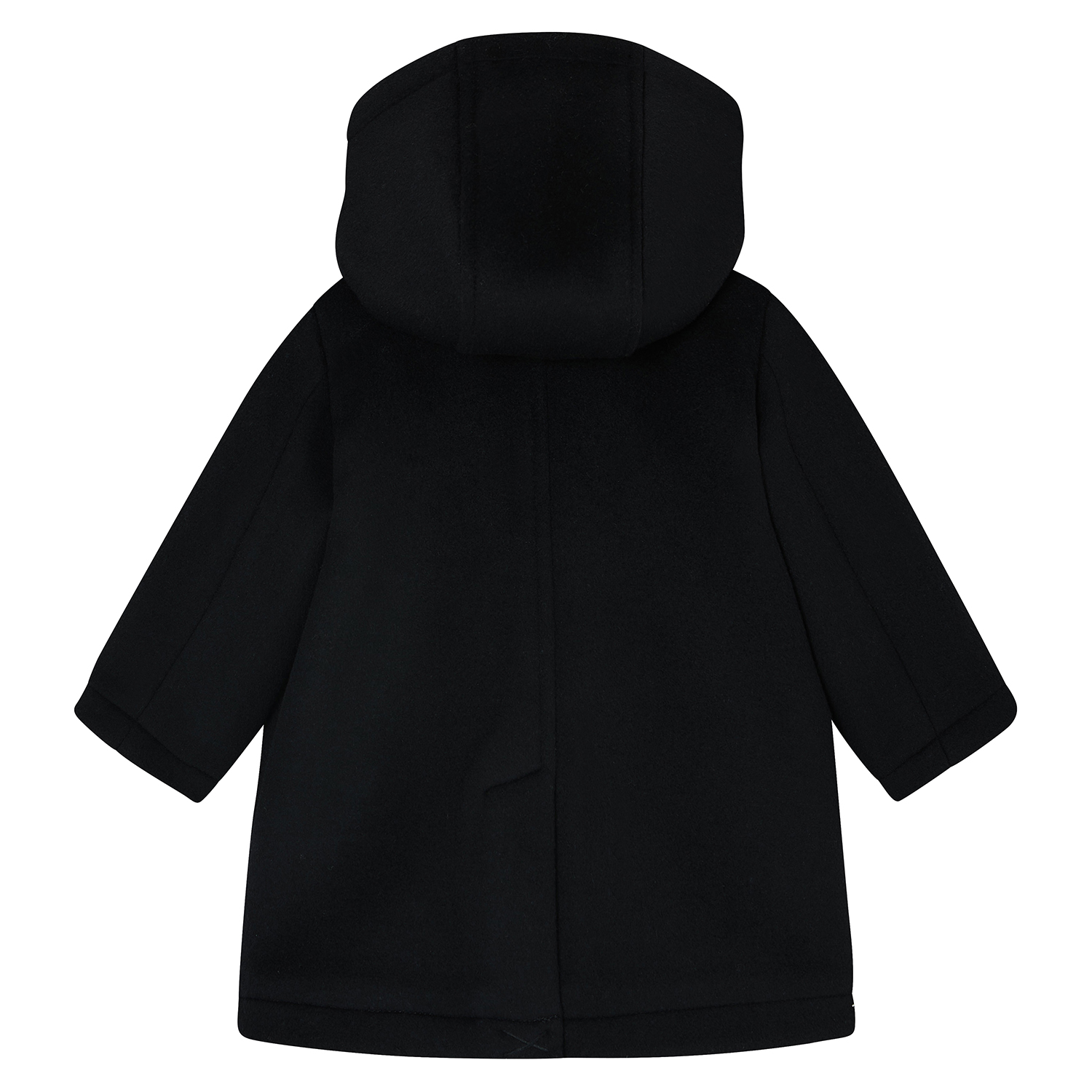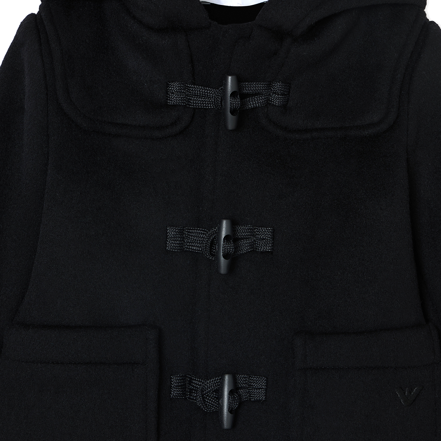 Emporio Armani μάλλινο μοντγκόμερι παλτό σεσκούρο μπλε χρώμα με κουκούλα, δύο τσέπες και διακριτικό κεντημένο λογότυπο αετού. Είναι πολύ απαλό, υποαλλεργικό και ζεστό.