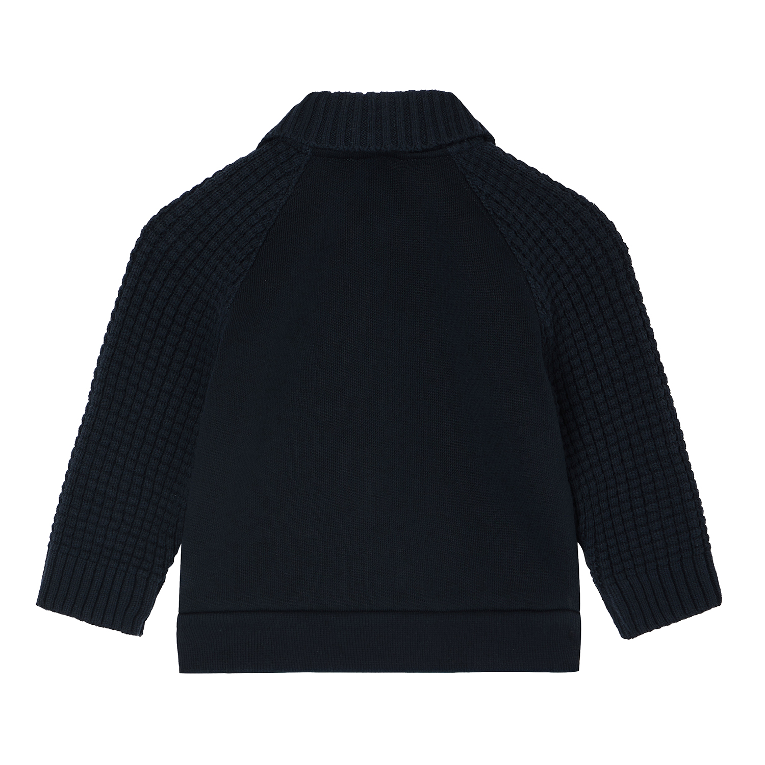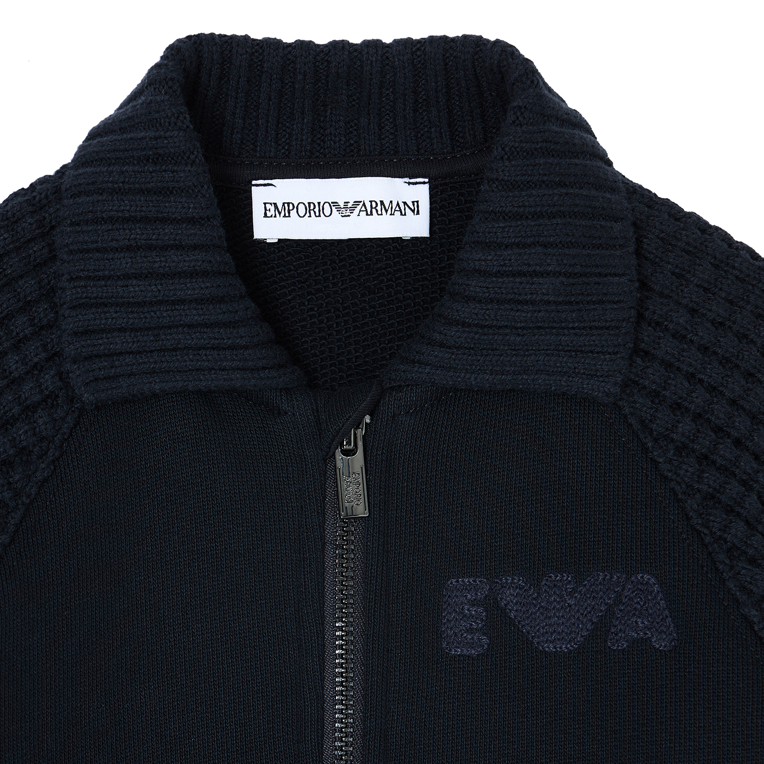 Emporio Armani σκούρη μπλε ζακέτα φούτερ από οργανικό βαμβάκι με φερμουάρ, πλεκτά μανίκια και γιακά με ριμπ σχέδιο. Διαθέτει tone-to-tone κεντημένο λογότυπο