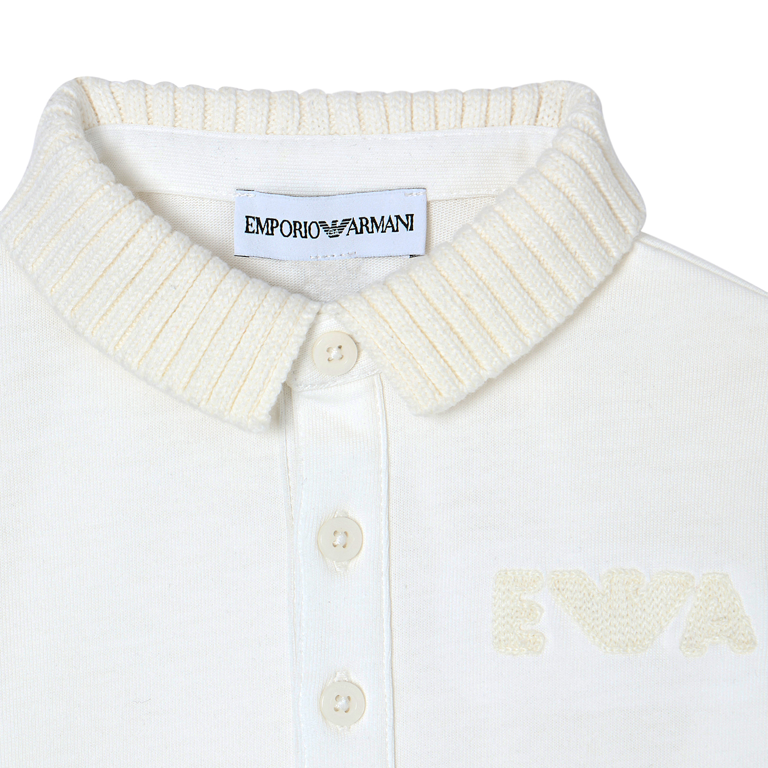 Emporio Armani υπόλευκη πόλο μπλούζα από οργανικό βαμβάκι με πλεκτό γιακά με ριμπ ύφανση και κεντημένο tone-to-tone λογότυπο στο στήθος.