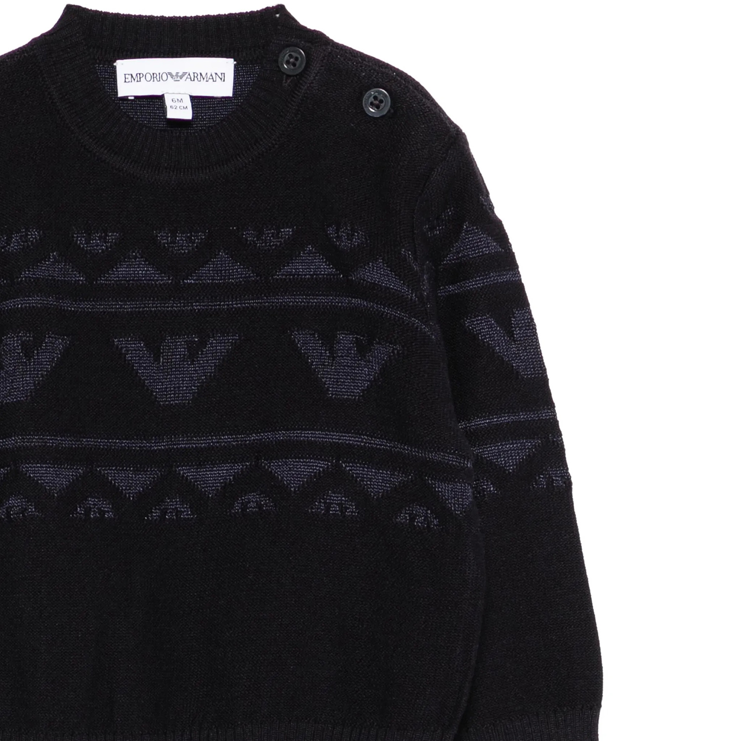 Emporio Armani σκούρο μπλε πλεκτό, φτιαγμένο από μείγμα μαλλιού και βισκόζης. Διαθέτει λογότυπα με αετό και στρογγυλή λαιμόκοψη, ενώ χάρη στην ποιότητα του υφάσματος του είναι πολύ απαλό και ζεστό. Διαθέτει κουμπιά στον ώμο.