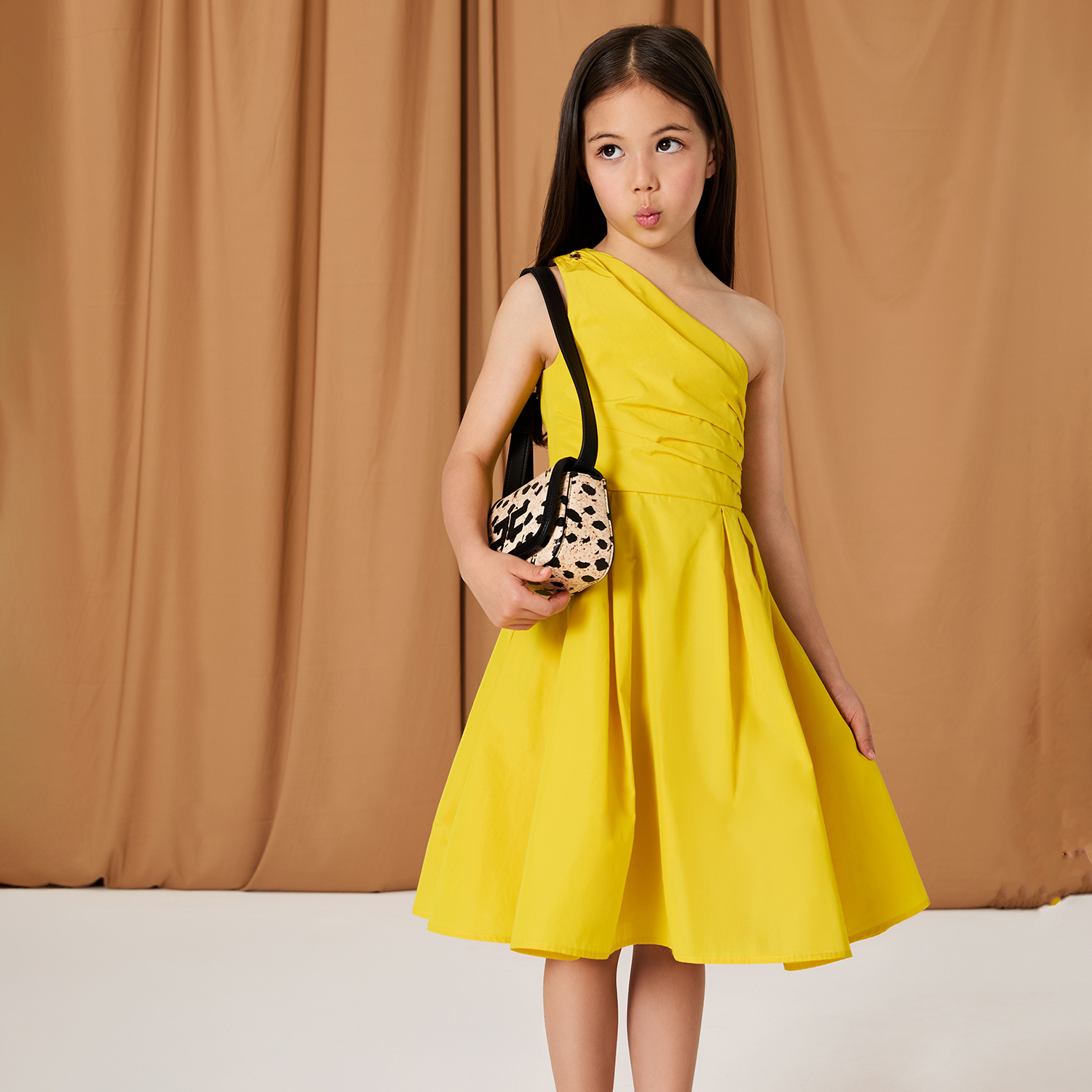 Elisabetta Franchi κίτρινο βαμβακερό φόρεμα ποπλίνα με έναν ώμο, ντραπέ λεπτομέρειες υφάσματος στο στήθος, πλισέ σχέδιο πίσω, απαλή φόδρα εσωτερικά και διακριτικό φερμουάρ στο πλάι.