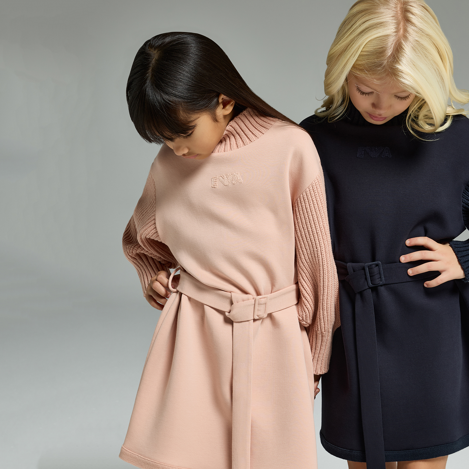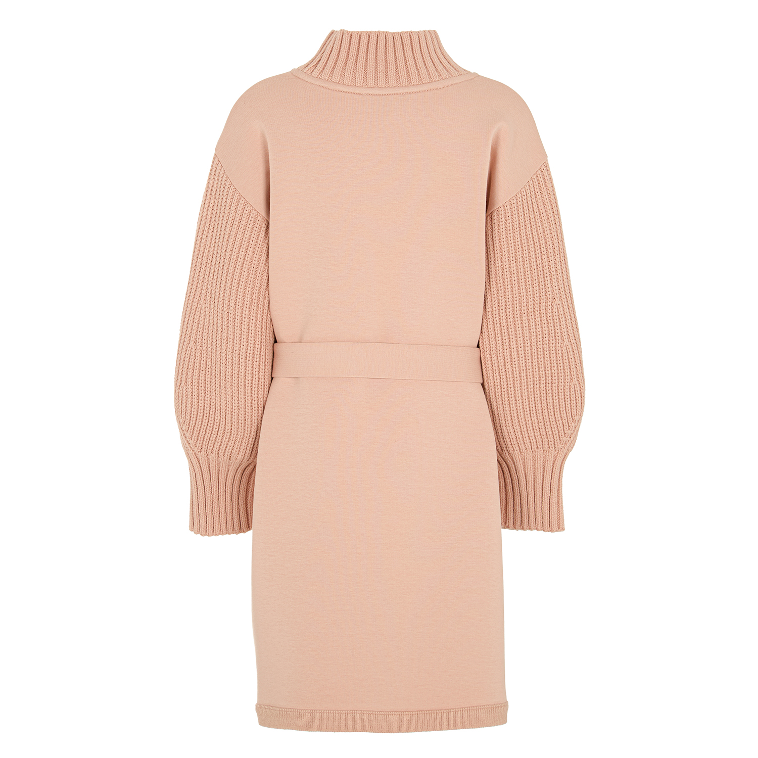 Emporio Armani ροζ σομόν φόρεμα από οργανικό βαμβάκι, με πλεκτό γιακά και μανίκια με ριμπ ύφανση, κεντημένο λογότυπο στο στήθος και ζώνη. Είναι πολύ απαλό και ελαστικό.