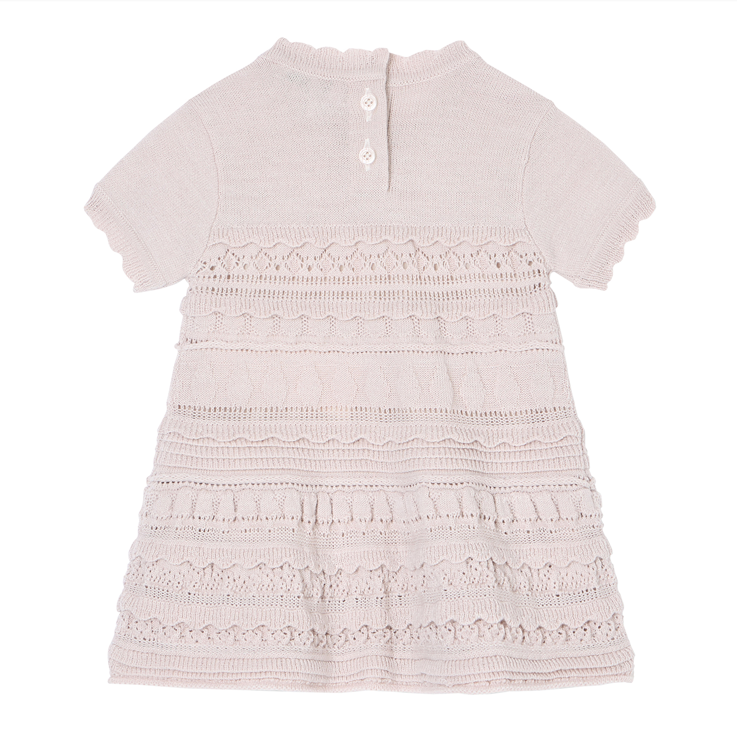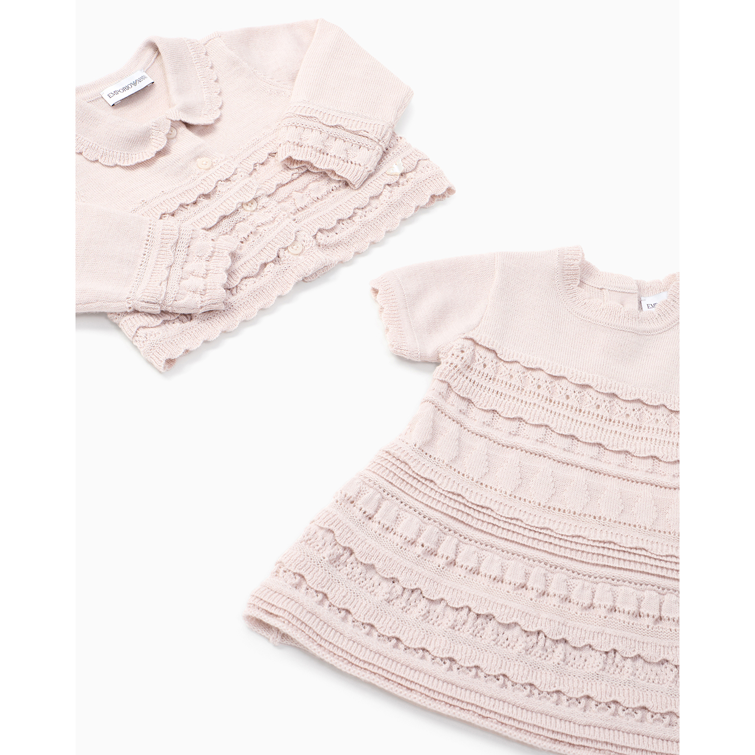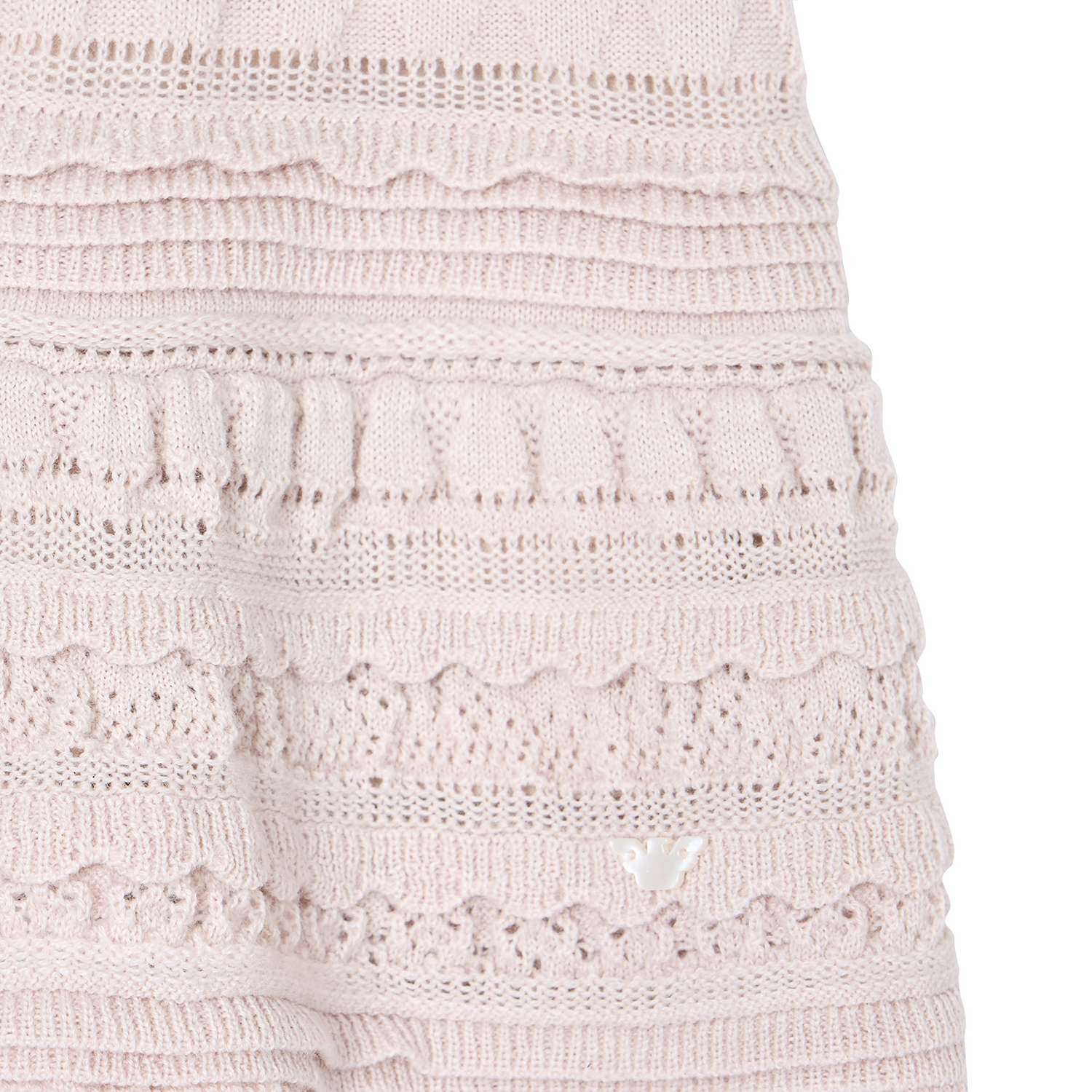 Emporio Armani μπεζ-νούντ πλεκτό φόρεμα από παρθένο μαλλί με κυματιστές λεπτομέρειες στην πλέξη. Είναι πολύ απαλό και ελαστικό και διαθέτει κούμπωμα με κουμπιά στο πίσω μέρος.