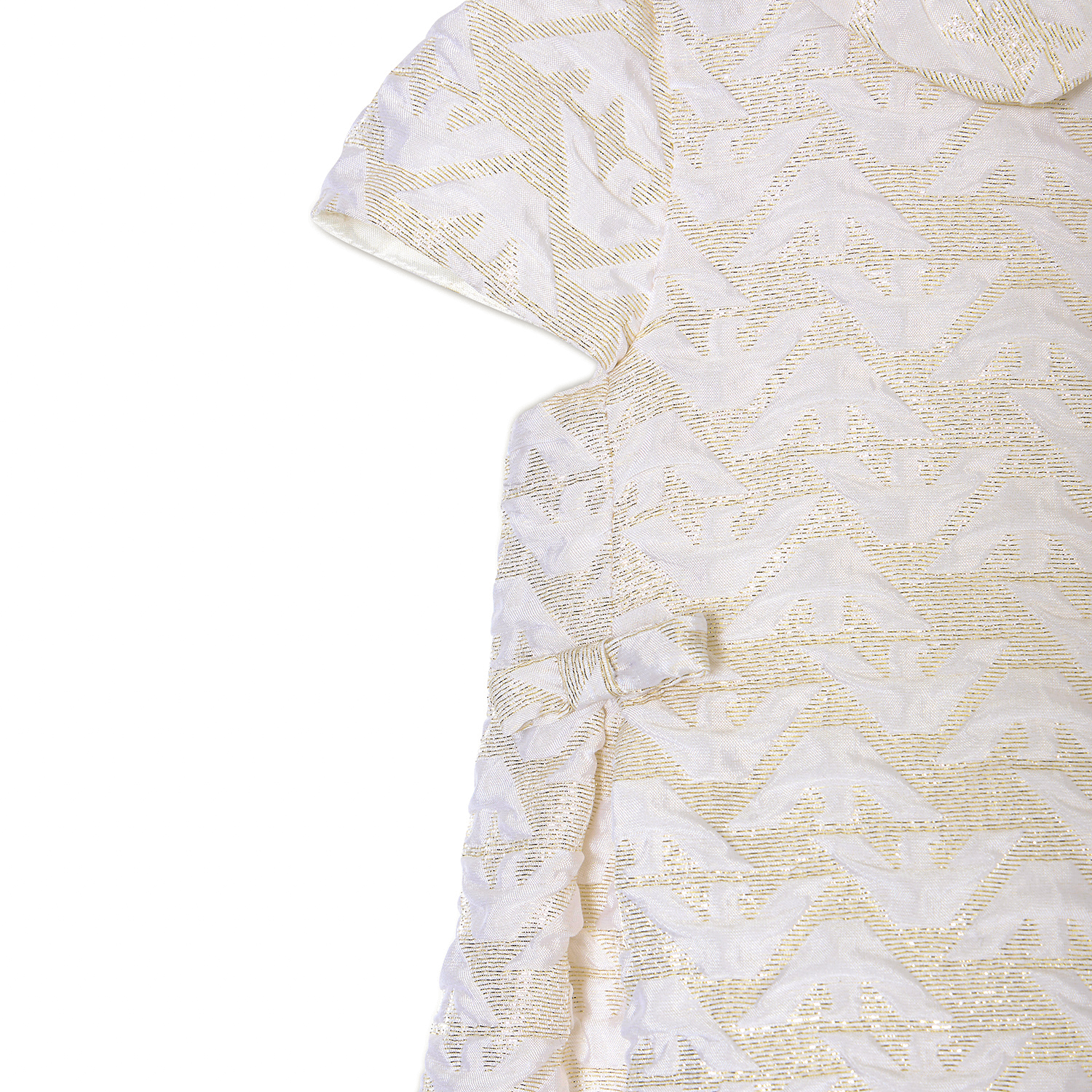 Emporio Armani επίσημοπ φόρεμα (σειρά “ceremony”) σε υπόλευκο χρώμα με μεταλλιζέ χρυσές ίνες και ανάγλυφα λογότυπα αετού. Διαθέτει κλασικό γιακά και κούμπωμα με κουμπιά στο πίσω μέρος.