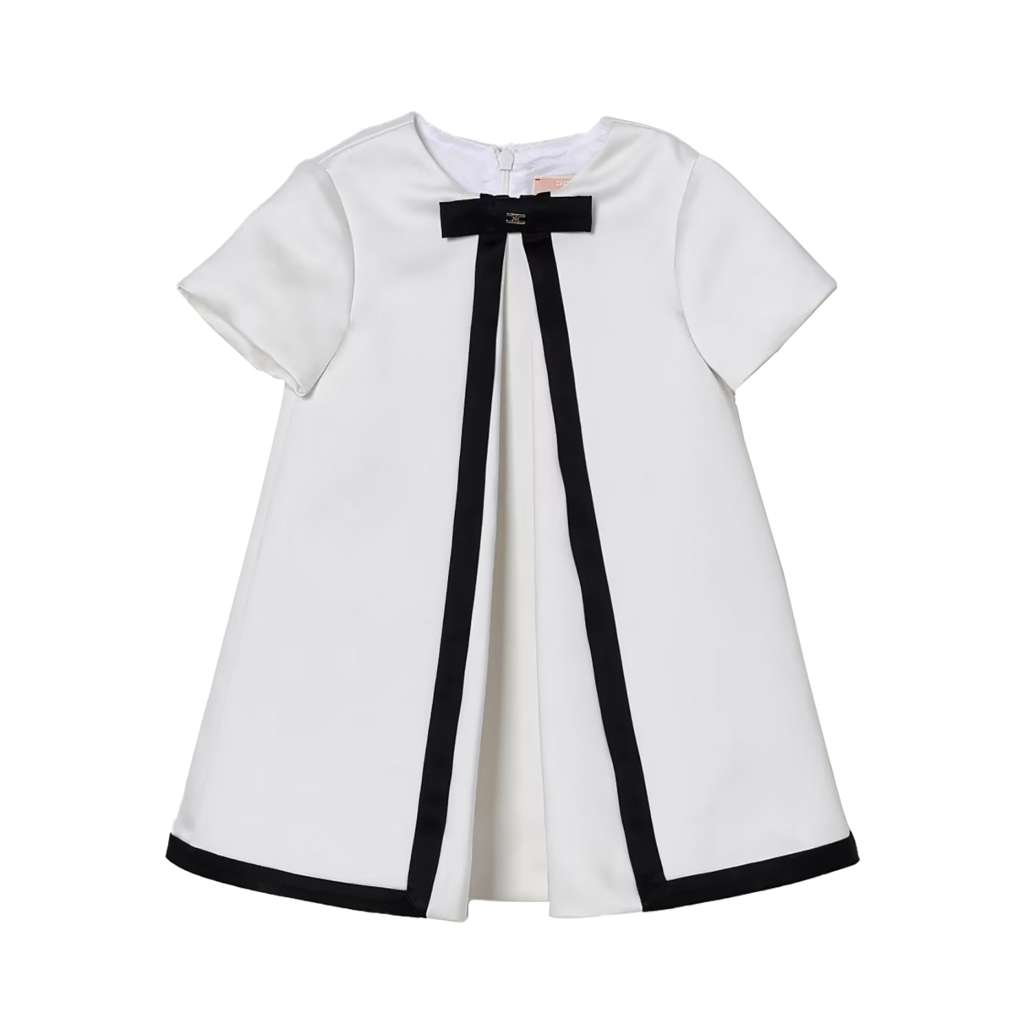 Elisabetta Franchi υπόλευκο φόρεμα σε απόδοση σατέν υφάσματος, με κεντρική πιέτα με μαύρο φιόγκο, διακριτικό φερμουάρ στο πίσω μέρος και απαλή φόδρα στο εσωτερικό.