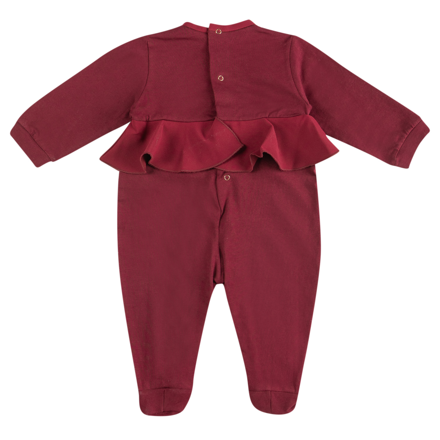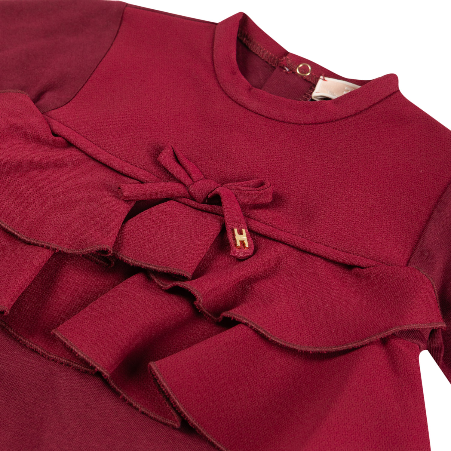 Elisabetta Franchi μπορντώ-κόκκινο βαμβακερό φορμάκι με 3D βολάν λεπτομέρειες και φιόγκο και κλείσιμο με κουμπιά στο πίσω μέρος.
