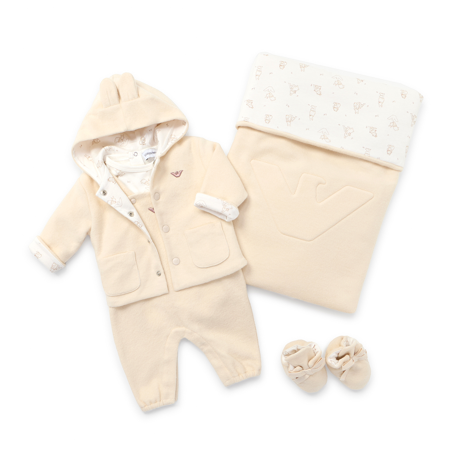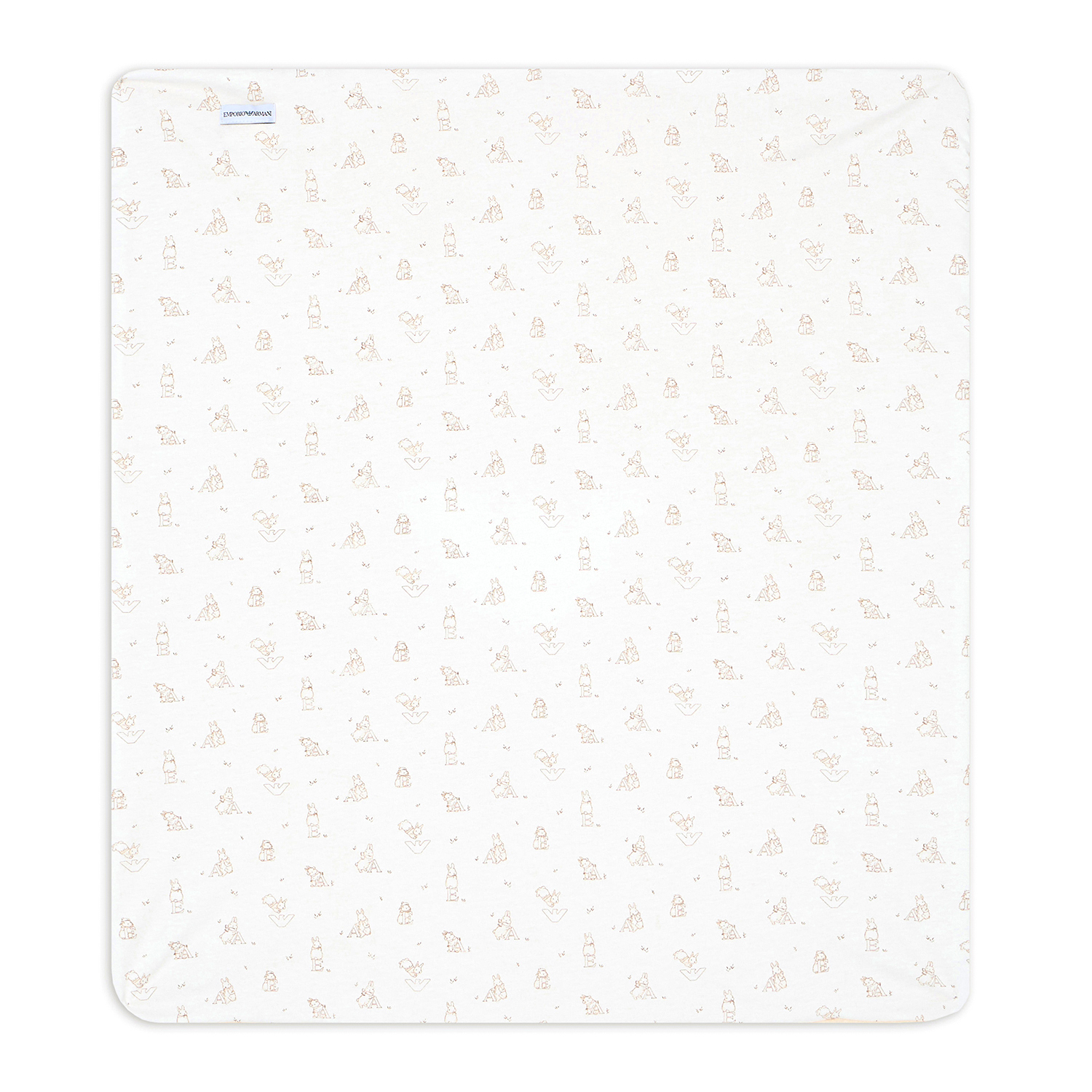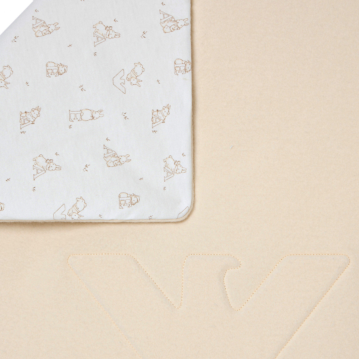 Emporio Armani βρεφική κουβέρτα από οργανικό βαμβάκι σε ιβουάρ-κρεμ χρώμα με ανάγλυφο tone-to-tone λογότυπο αετού. Η άλλη πλευρά διαθέτει τυπωμένο σχέδιο παντού.