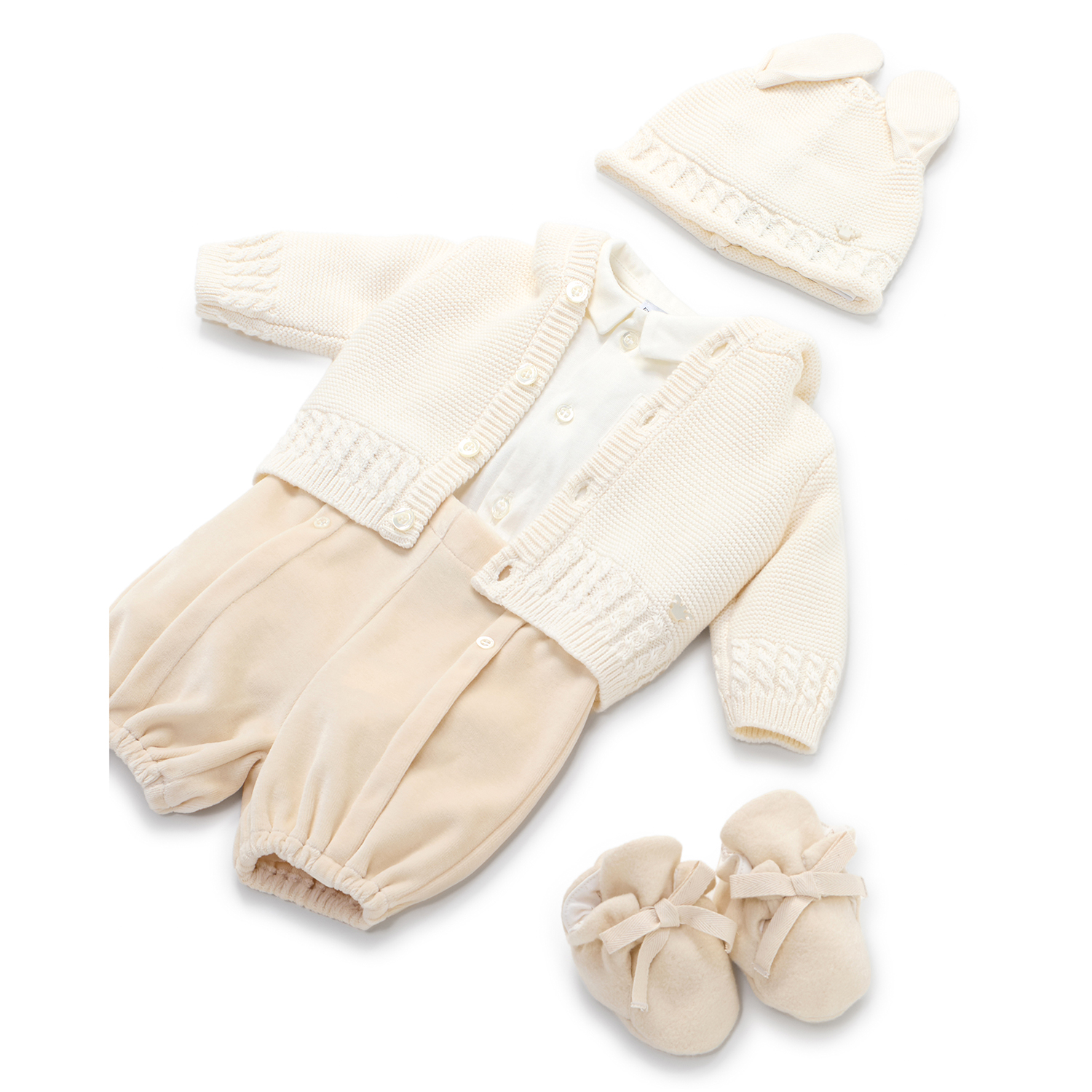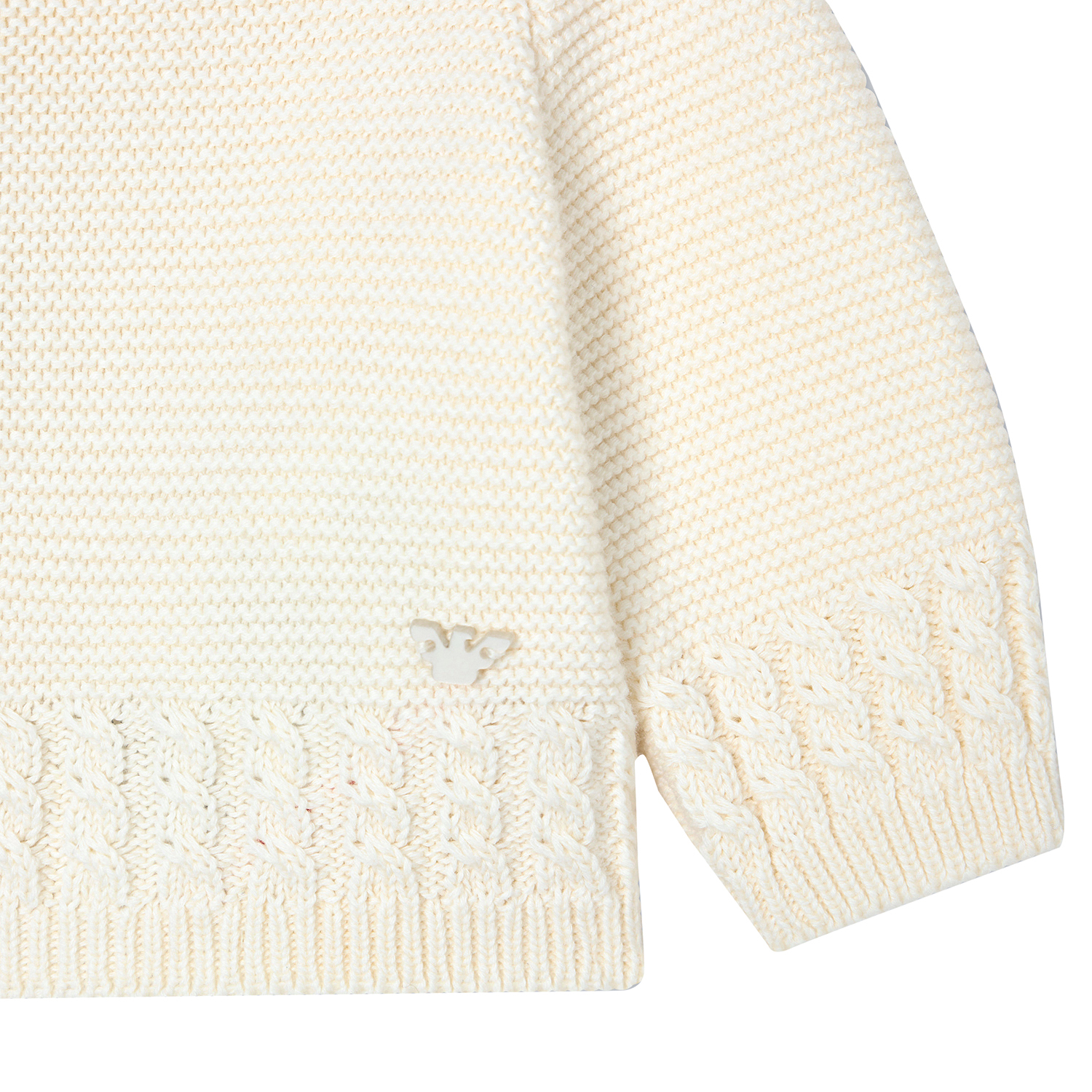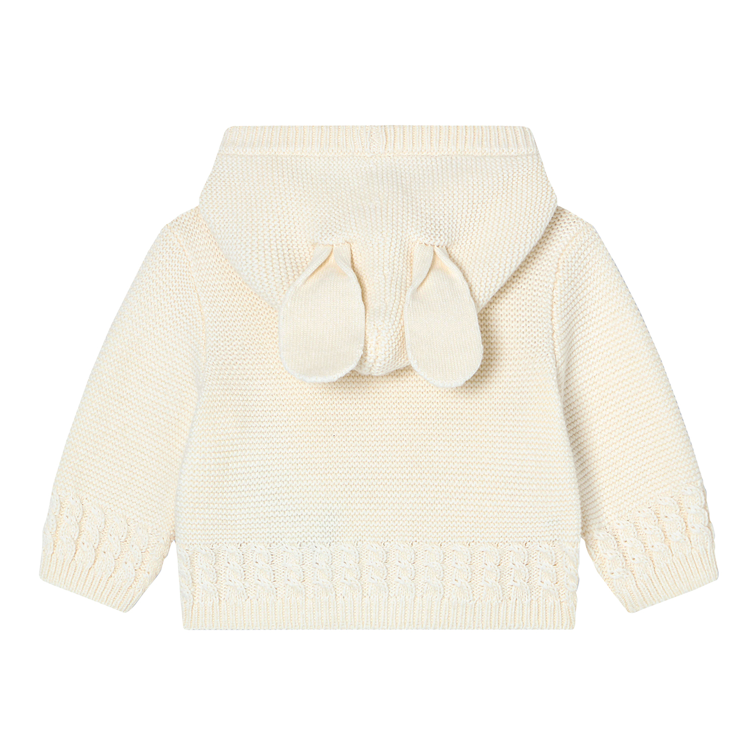 Emporio Armani πλεκτή ζακέτα σε ιβουάρ χρώμα από βαμβάκι και κασμίρι. Διαθέτει κουκούλα με σχέδιο αυτιών.