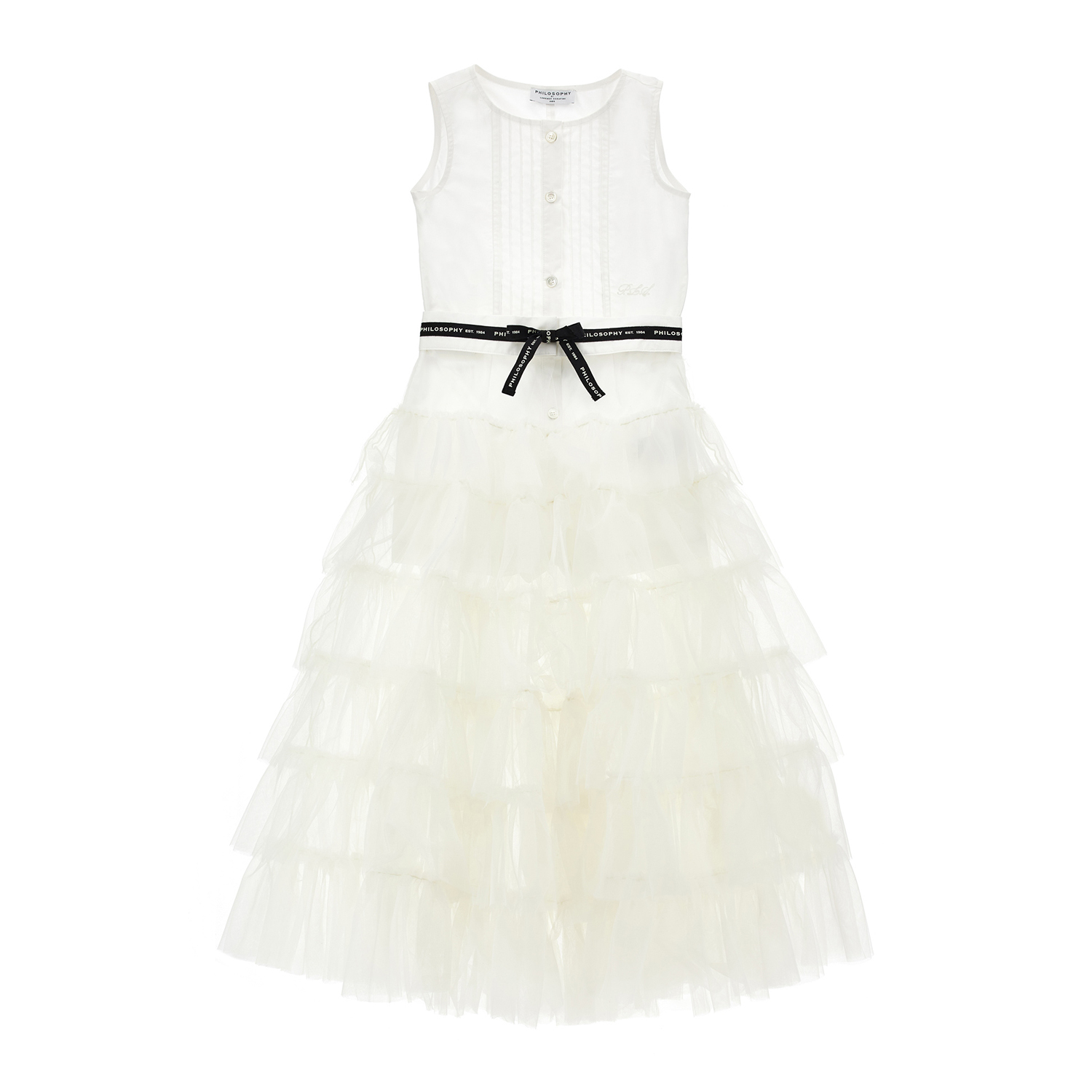 Philosophy di Lorenzo Serafini υπόλευκο σετ, αποτελούμενο από ένα βαμβακερό κορμάκι-body και mia μακριά τούλινη φούστα με βολάν. Η φούστα κουμπώνει γύρω από τη μέση με κουμπί και κορδόνι, ενώ το κορμάκι έχει πλισέ σχέδιο μπροστά.