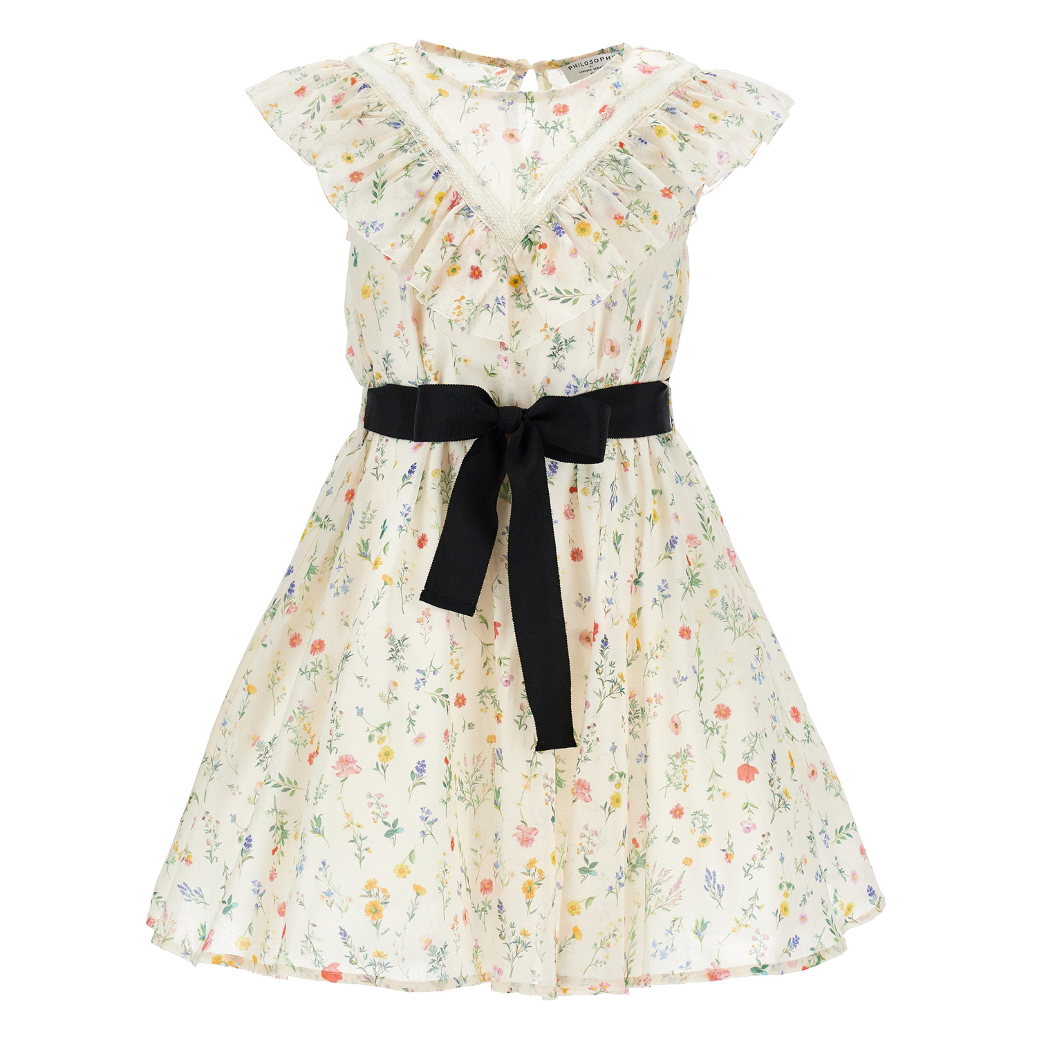 Philosophy di Lorenzo Serafini υπόλευκο φόρεμα από απαλό βαμβακερό ύφασμα με φλοράλ μοτίβο, δαντέλα, βολάν και μαύρη βαμβακερή ζώνη. Εσωτερικά διαθέτει ένθετο από τούλι για όγκο και κίνηση, καθώς και απαλή βαμβακερή επένδυση.