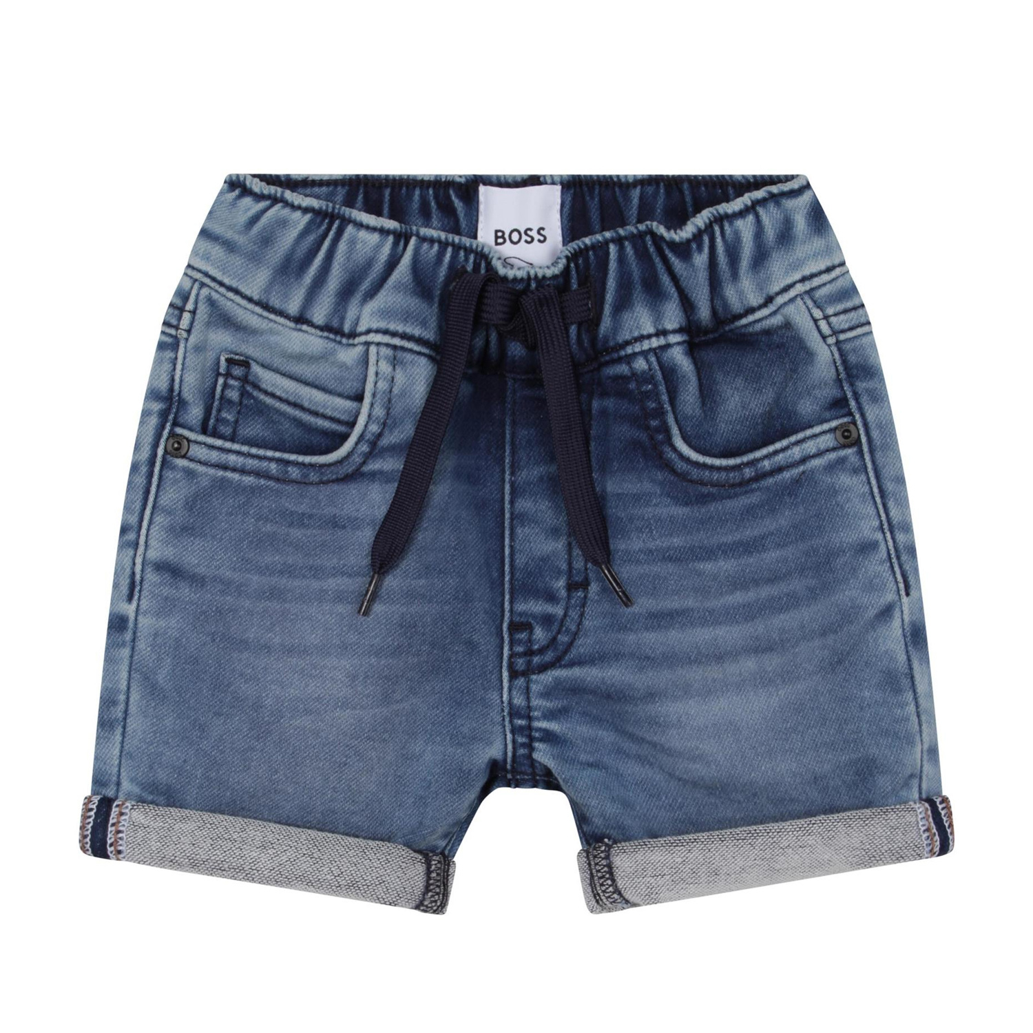 Hugo Boss τζιν μπλε βαμβακερό κοντομάνικο πουκάμισο με εμπριμέ μονογράμματα.