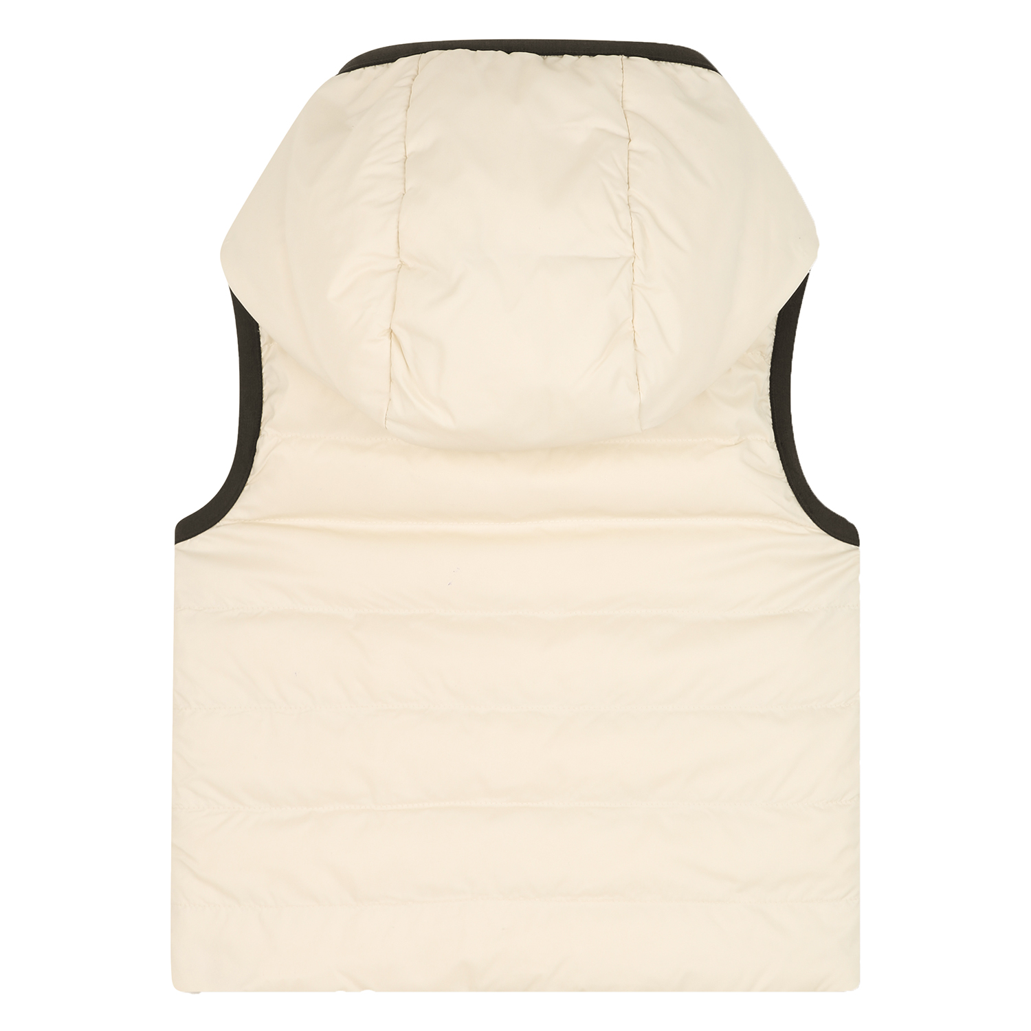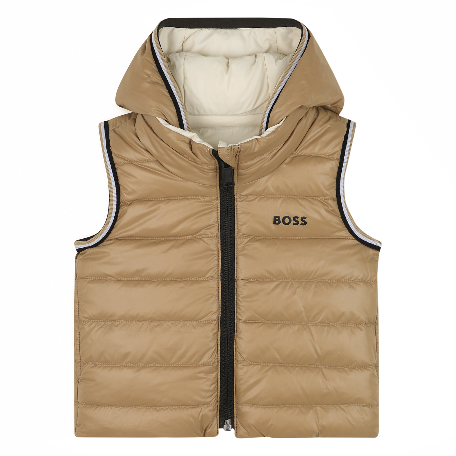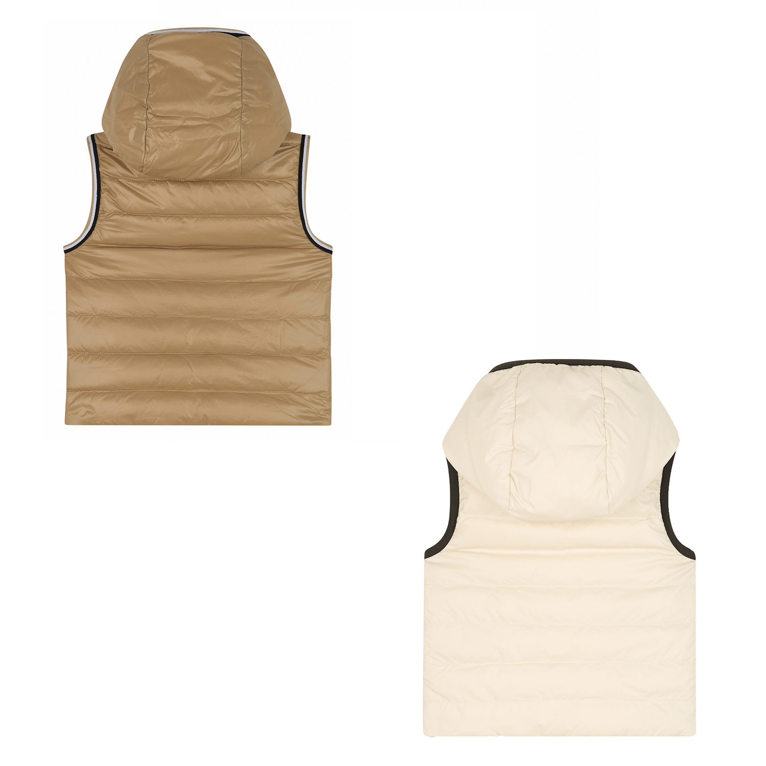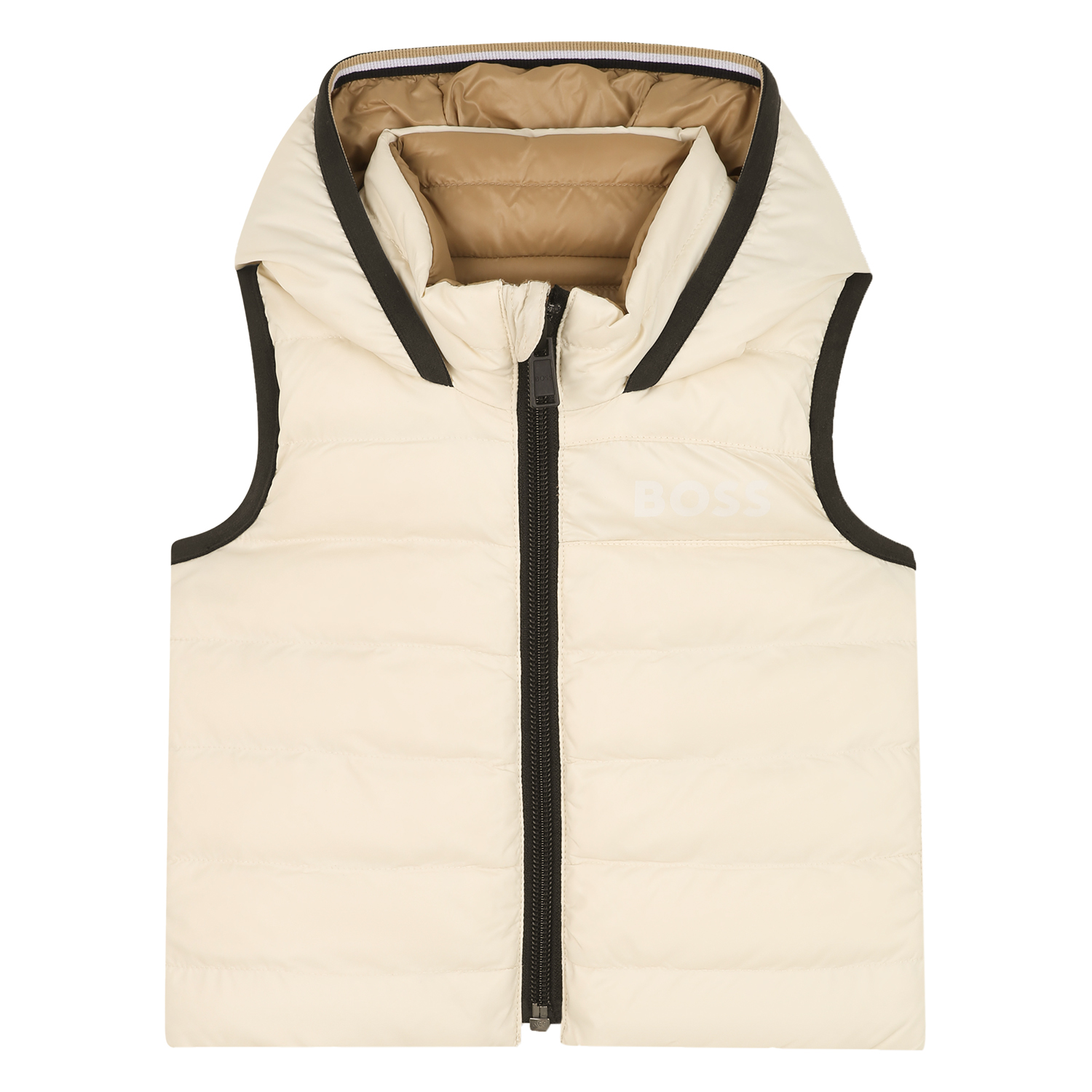 Hugo Boss γιλέκο με ελαφριά επένδυση, σε ιβουάρ και μπεζ-καμηλό χρώμα. Διαθέτει κουκούλα, φερμουάρ, διακριτικά λογότυπα και ριγέ λεπτομέρειες στις μασχάλες.
