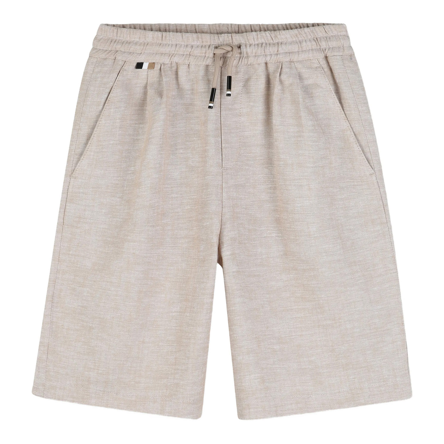 Hugo Boss μπεζ σορτς κατασκευασμένο από λινό και βισκόζη, με ελαστική μέση με κορδόνι περίσφιξης και πλαϊνές τσέπες.