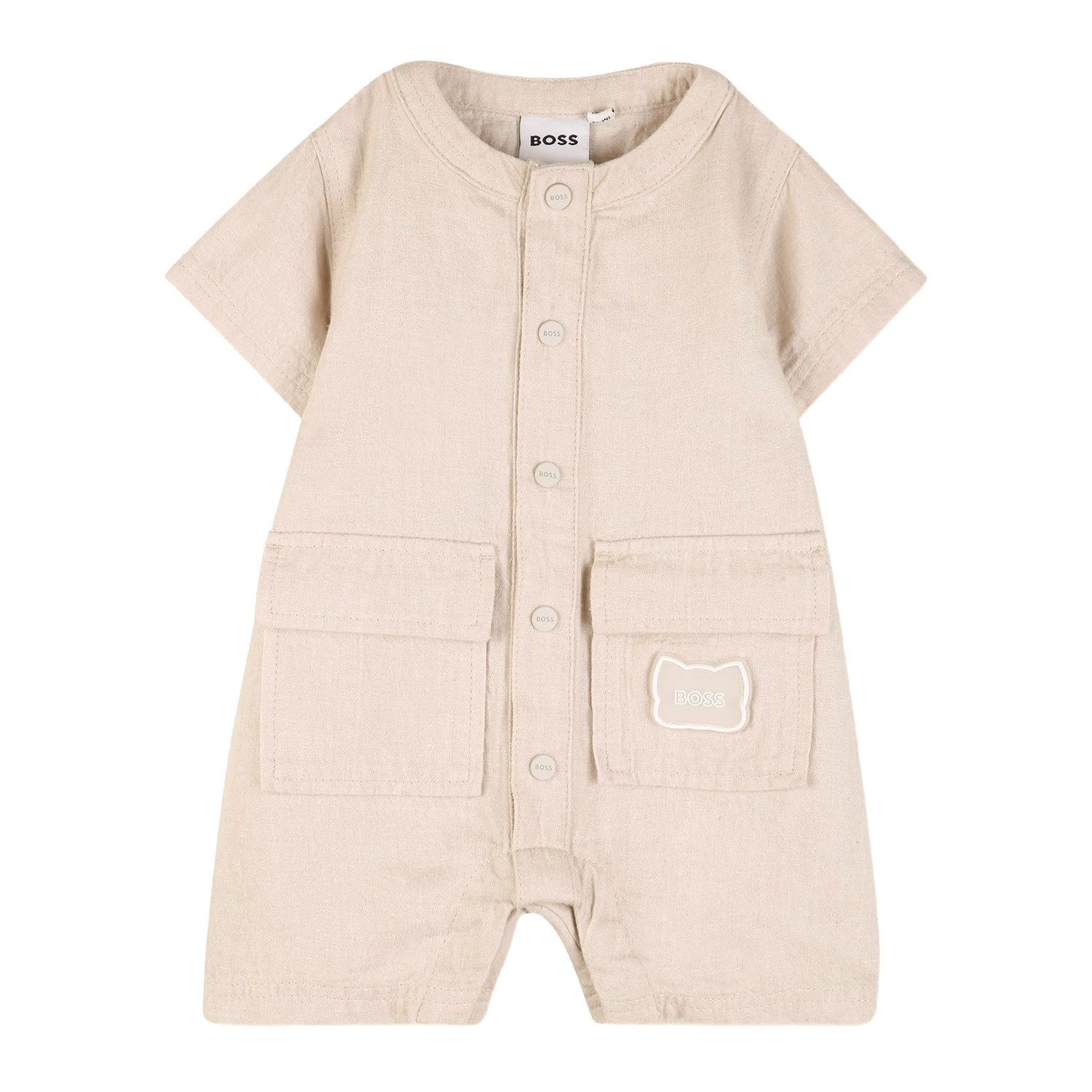 Hugo Boss μπεζ της άμμου βαμβακερό/λινό φορμάκι με τσέπες τύπου cargo και κουμπιά popper.