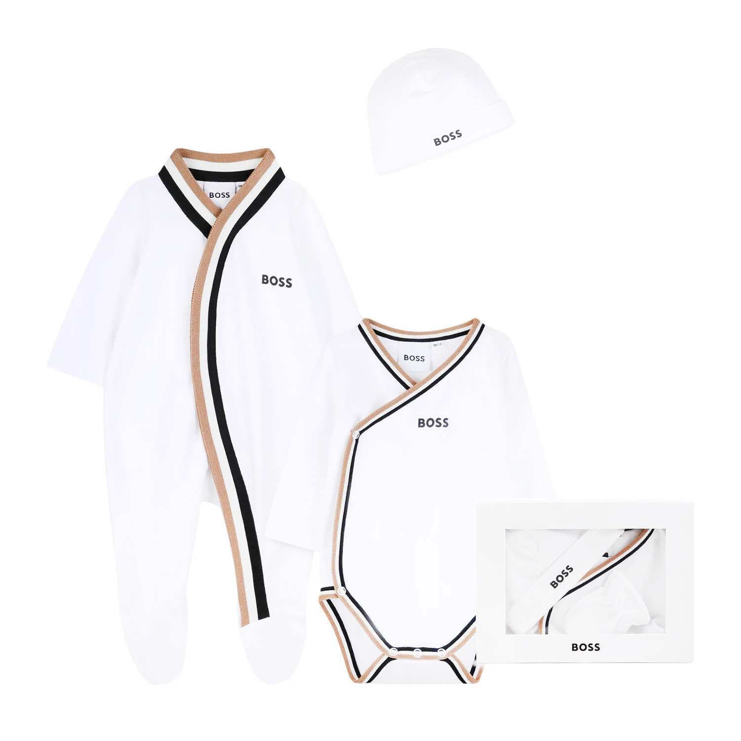 Hugo Boss λευκό βρεφικό σετ από οργανικό βαμβάκι. Περιλαμβάνει ένα φορμάκι με μακριά μανίκια, ένα εσώρουχο, ένα ασορτί σκουφάκι και γάντια. Όλα τα ενδύματα διαθέτουν ριγέ λεπτομέρειες και κουμπιά. Περιλαμβάνεται συσκευασία δώρου.