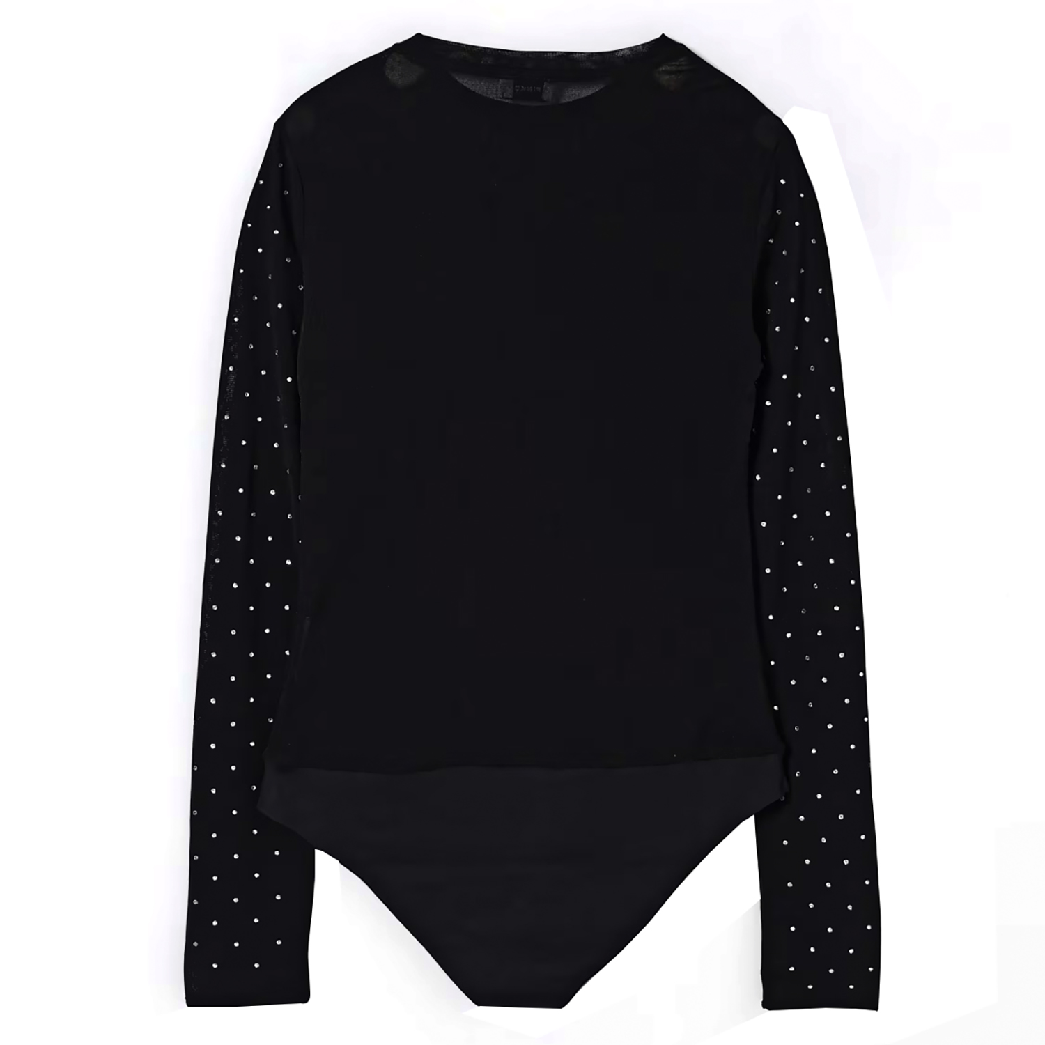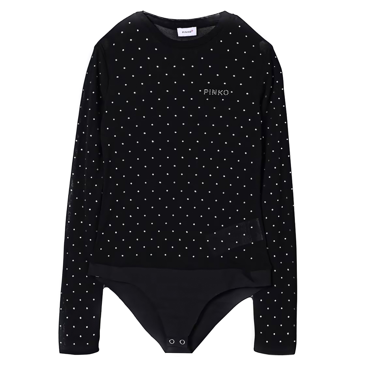 Pinko μαύρο τούλινο all-in-one body με εφαρμογές από στρας σε όλη την επιφάνεια και απαλό κάτω μέρος με κουμπιά.