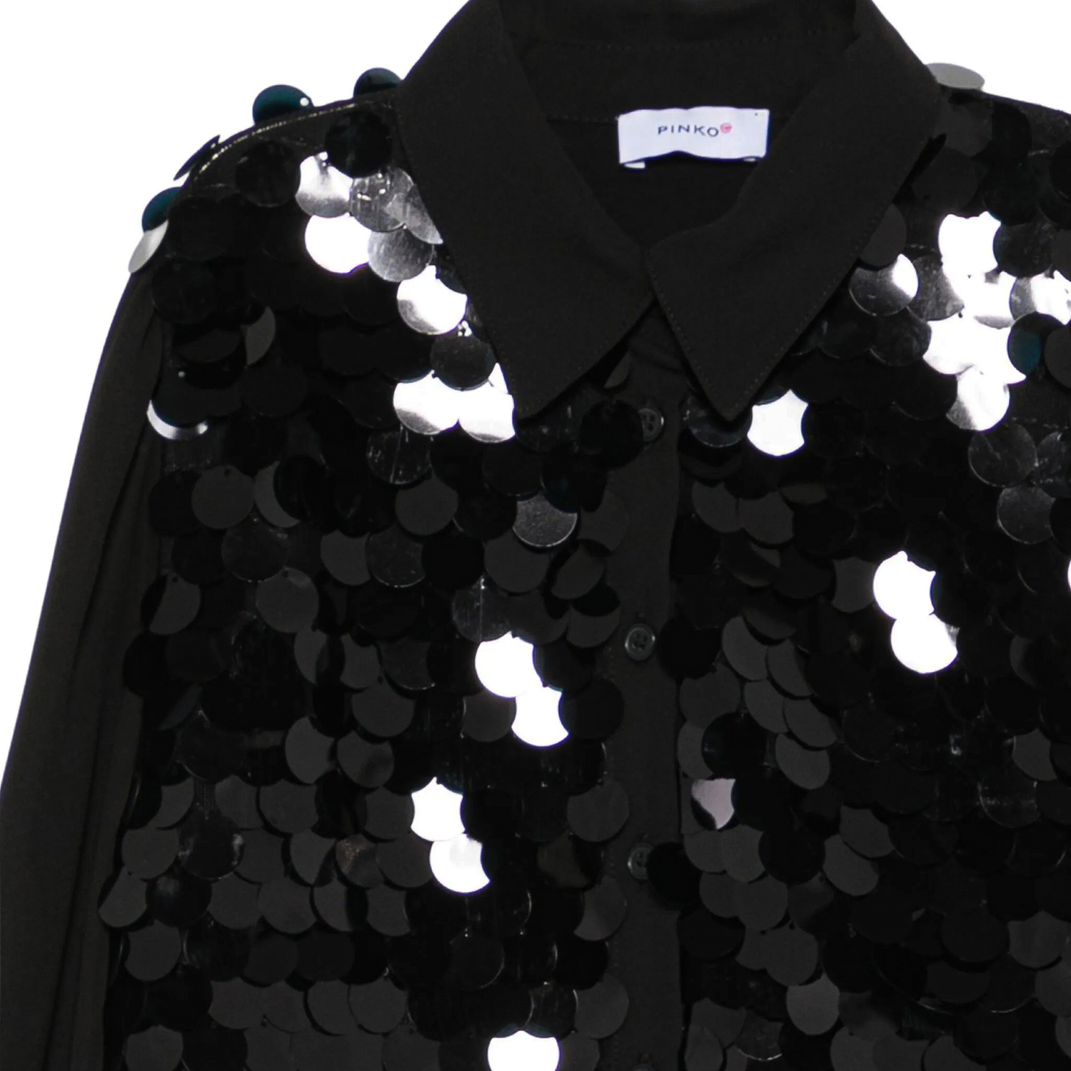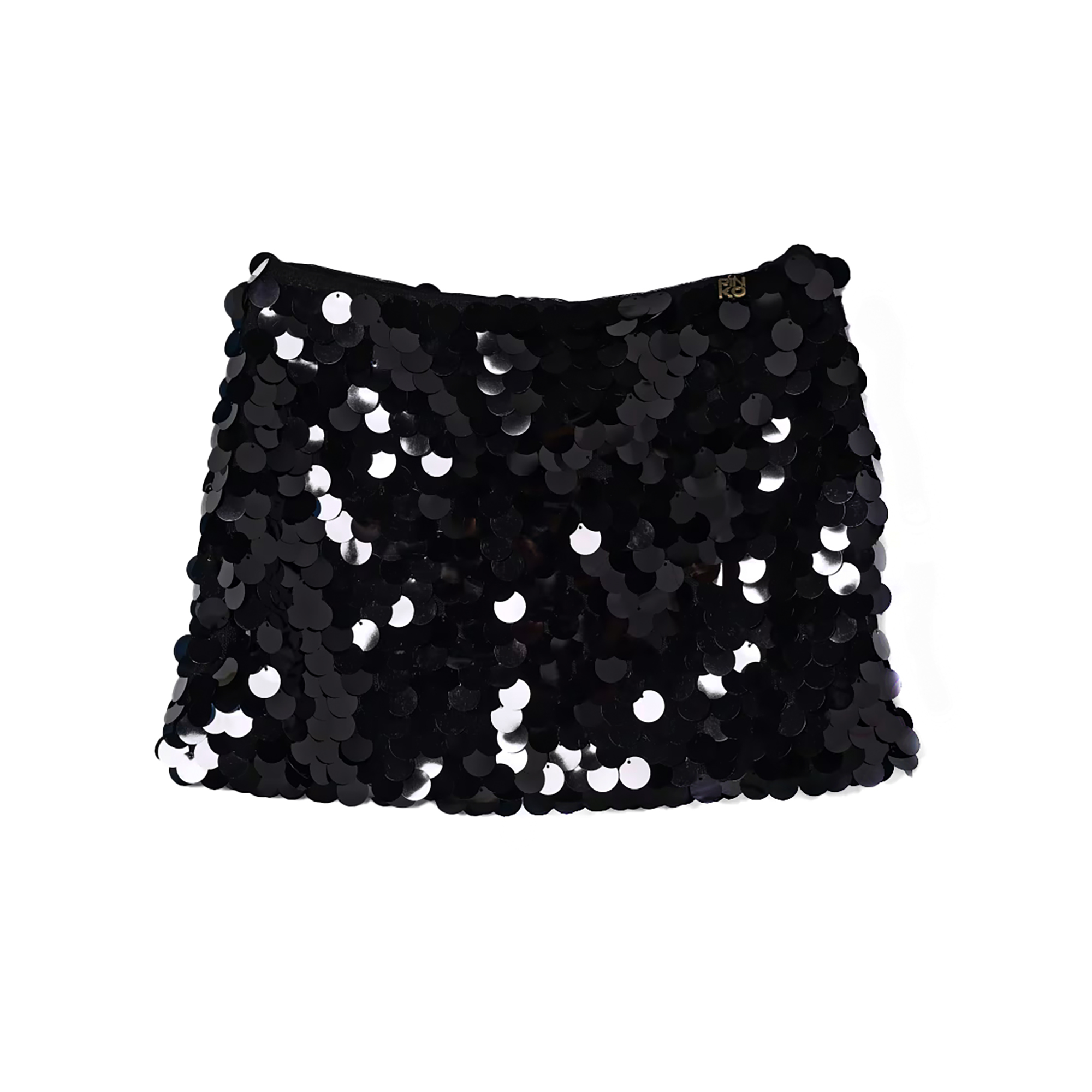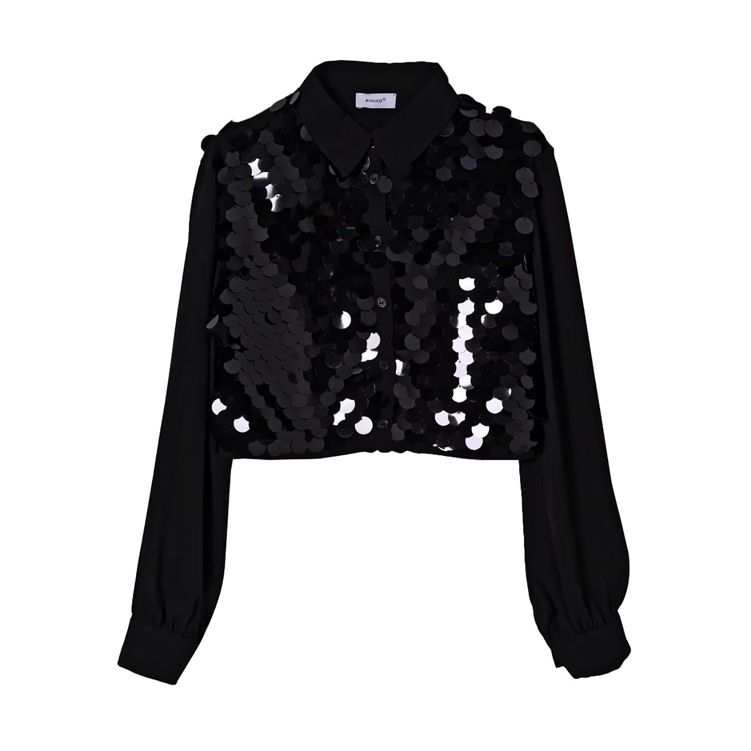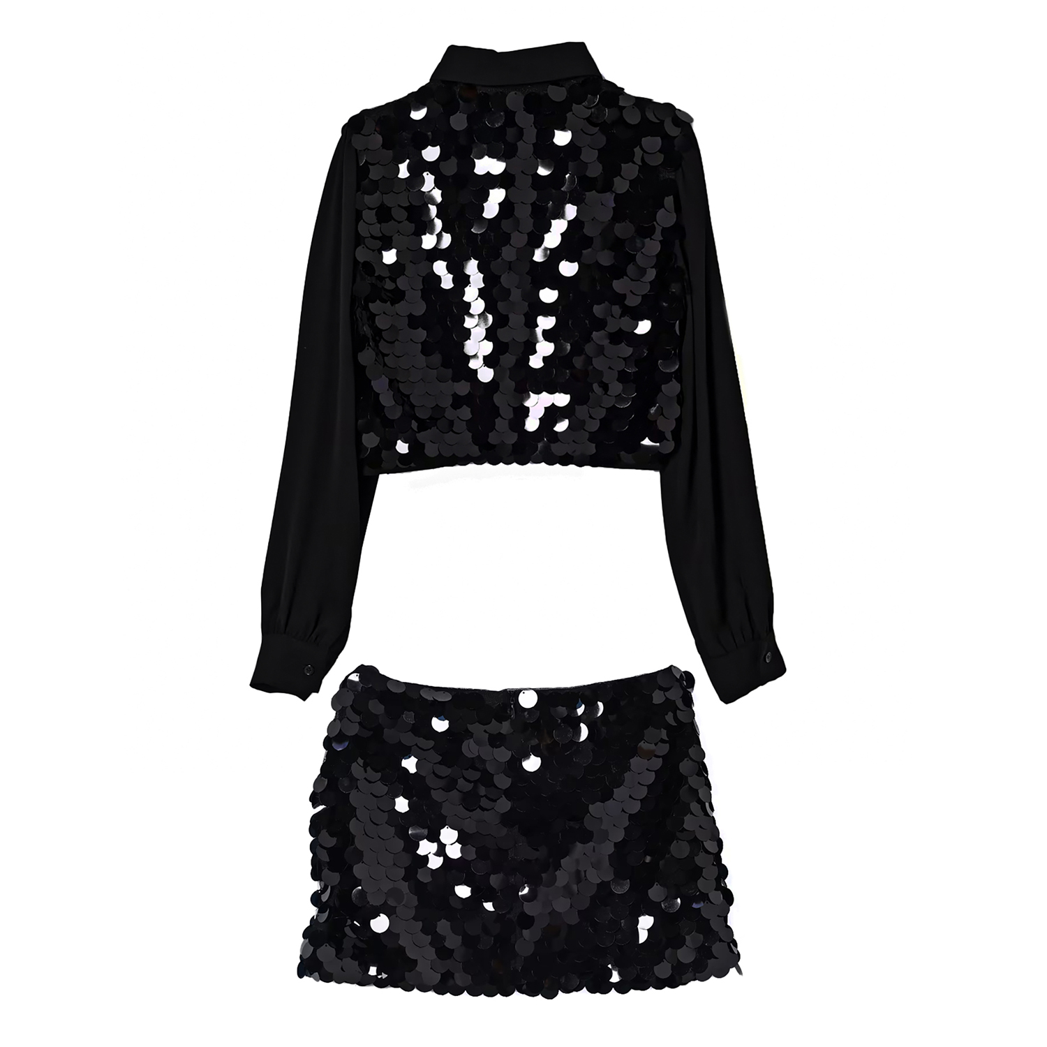 Pinko μαύρο σετ το οποίο περιλαμβάνει ένα κροπ πουκάμισο με απλικέ παγιέτες και φουσκωτά μανίκια από οργάντζα και μια μίνι φούστα με πλισέ παγιέτες σε μαύρο-ανθρακί χρώμα, απαλή εσωτερική επένδυση και διακριτικό κούμπωμα. Εσωτερικά η φόδρα της φούστας είναι σορτς για να καλύπτει κατά την κίνηση.