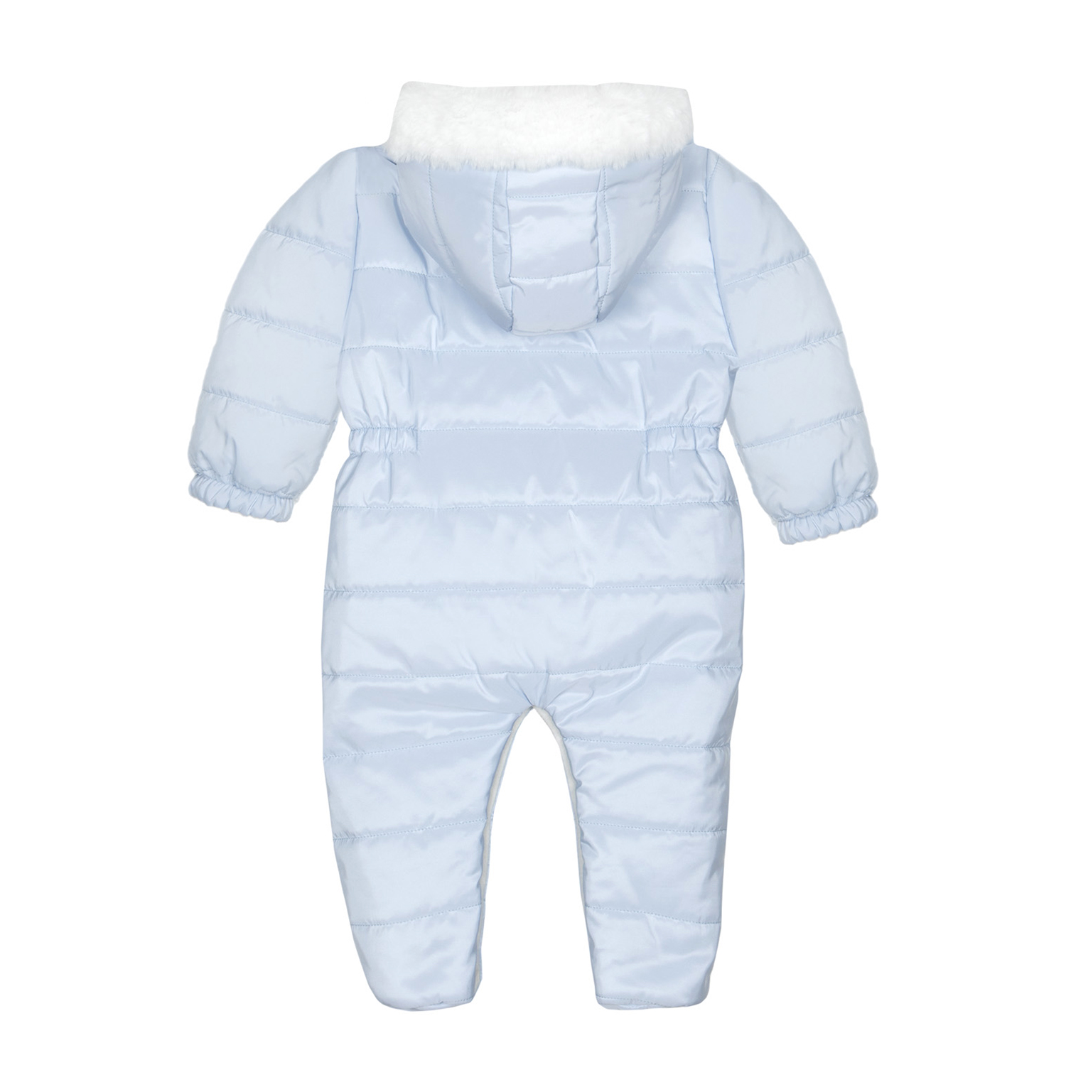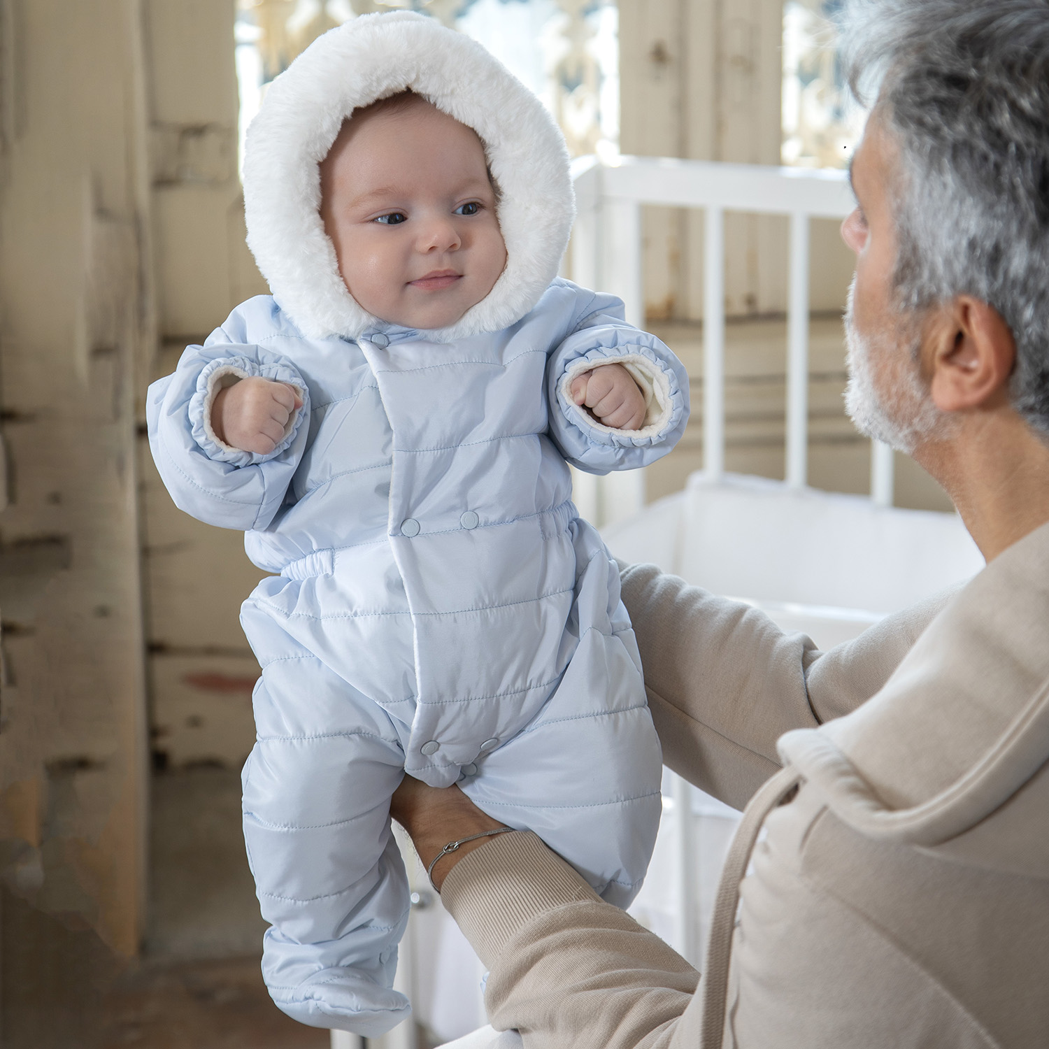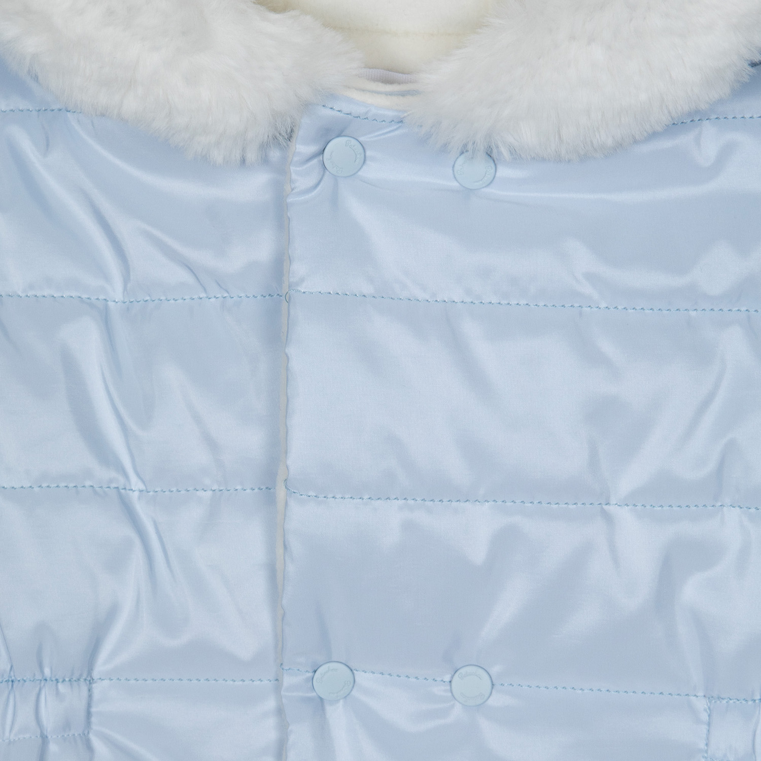 Patachou σιέλ φόρμα εξόδου με επένδυση και κουκούλα. Διαθέτει εσωτερικό μέρος από λευκή οικολογική γούνα, ελαστικά μέρη στη μέση και κλείσιμο με κουμπιά.