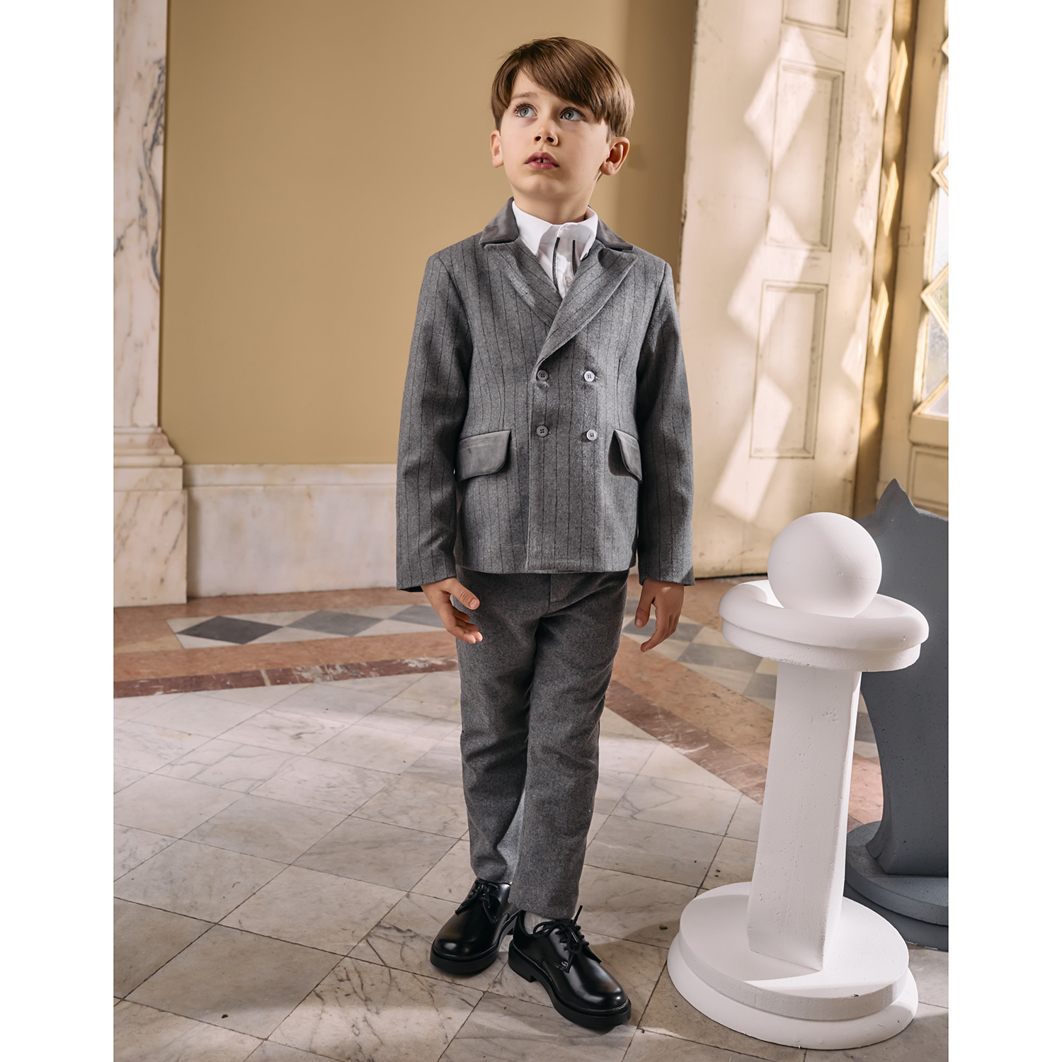 Patachou επίσημο σετ κοστουμιού σε γκρι ύφασμα μαλλί-βισκόζη. Περιλαμβάνει σακάκι σταυρωτό με ριγέ σχέδιο, μονόχρωμο παντελόνι και ένα λευκό πουκάμισο με γκρι λεπτομέρειες.