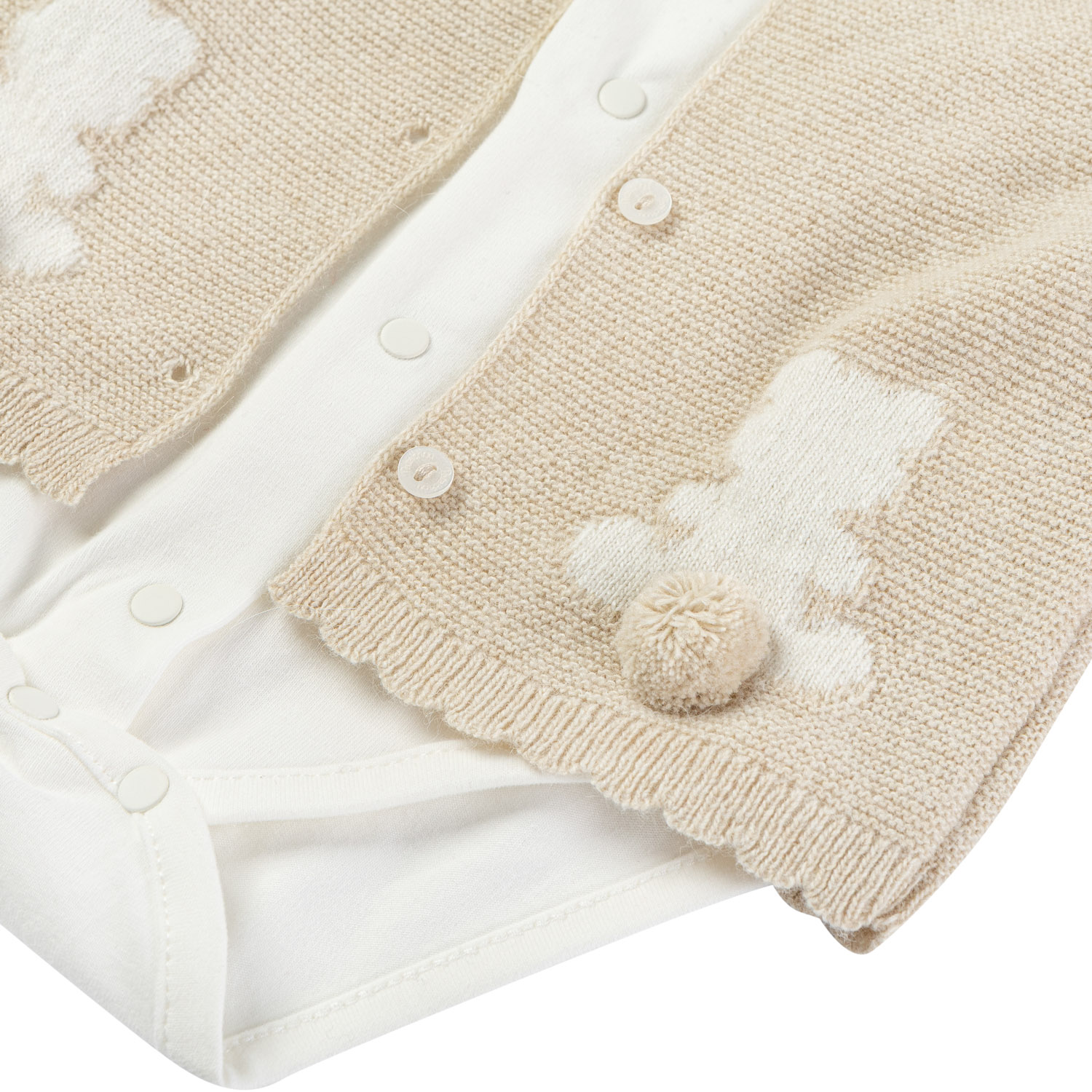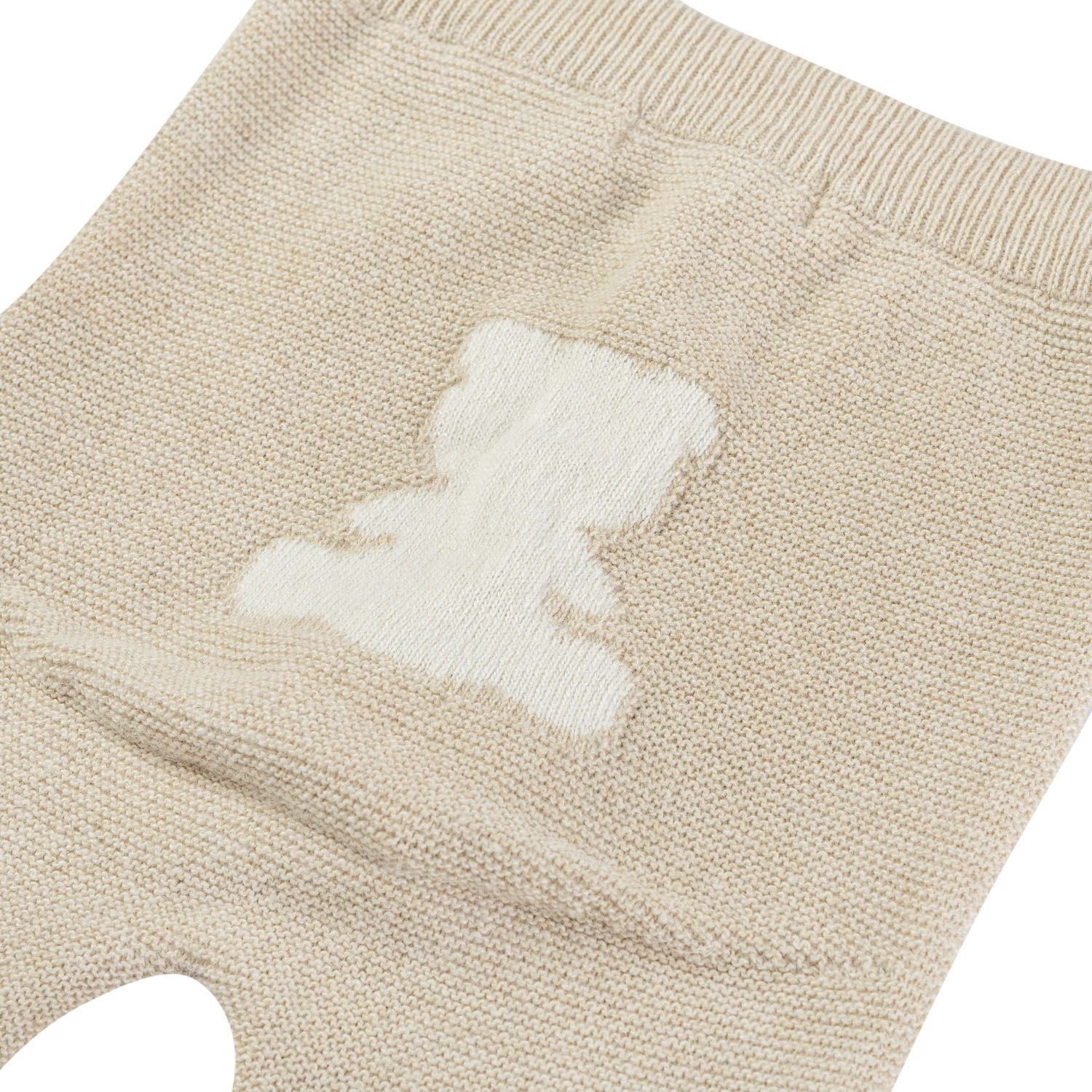 Patachou ανοιχτό μπεζ πλεκτό σετ από ζακέτα και παντελόνι από μείγμα βισκόζης, μαλλί Merino και κασμίρι. Η ζακέτα διαθέτει λεπτομέρειες με πομ πομ, αρκουδάκια και κυματιστές λεπτομέρειες, ενώ το παντελόνι έχει ασορτί αρκουδάκι. Έρχεται με ένα ασορτί φορμάκι με ασορτί print.