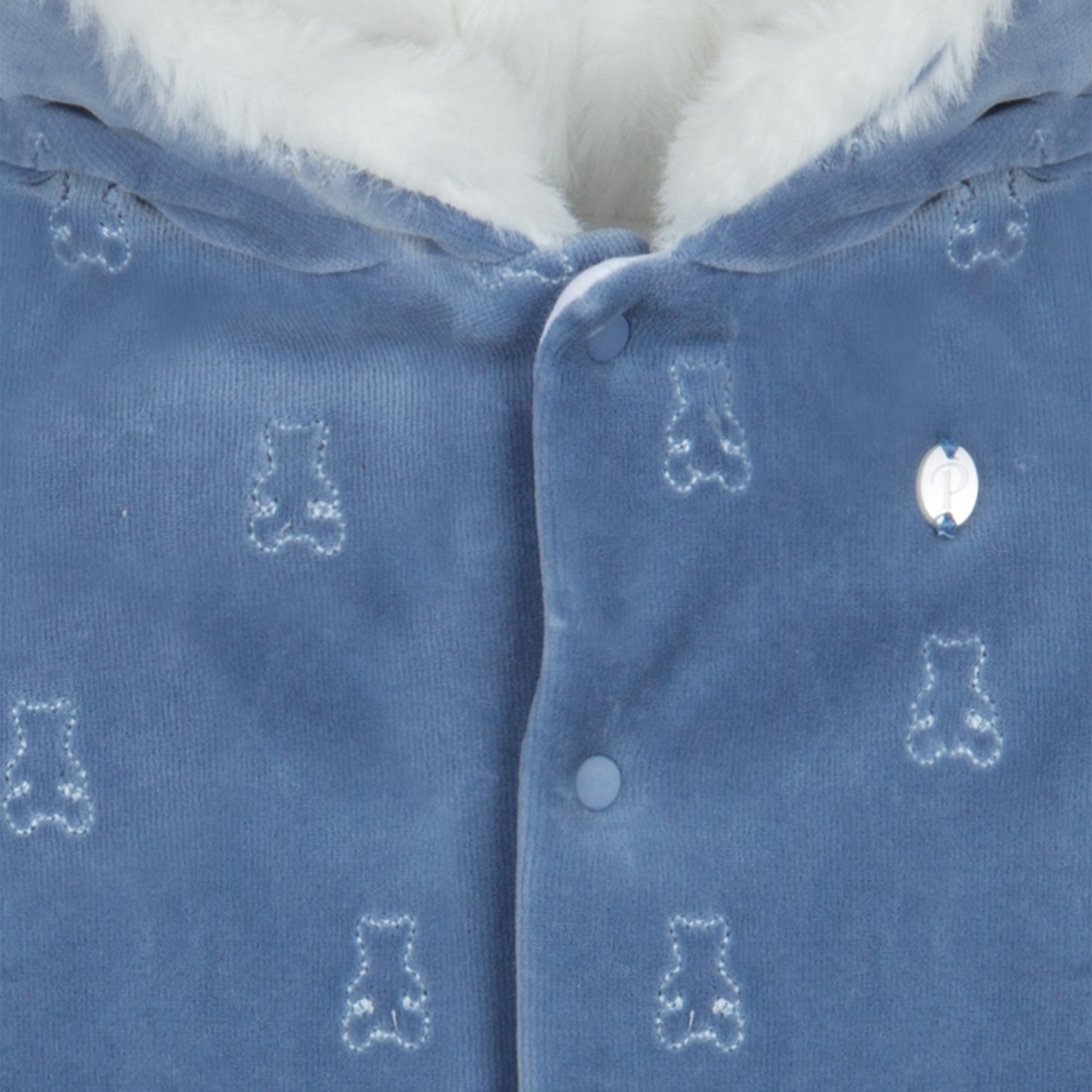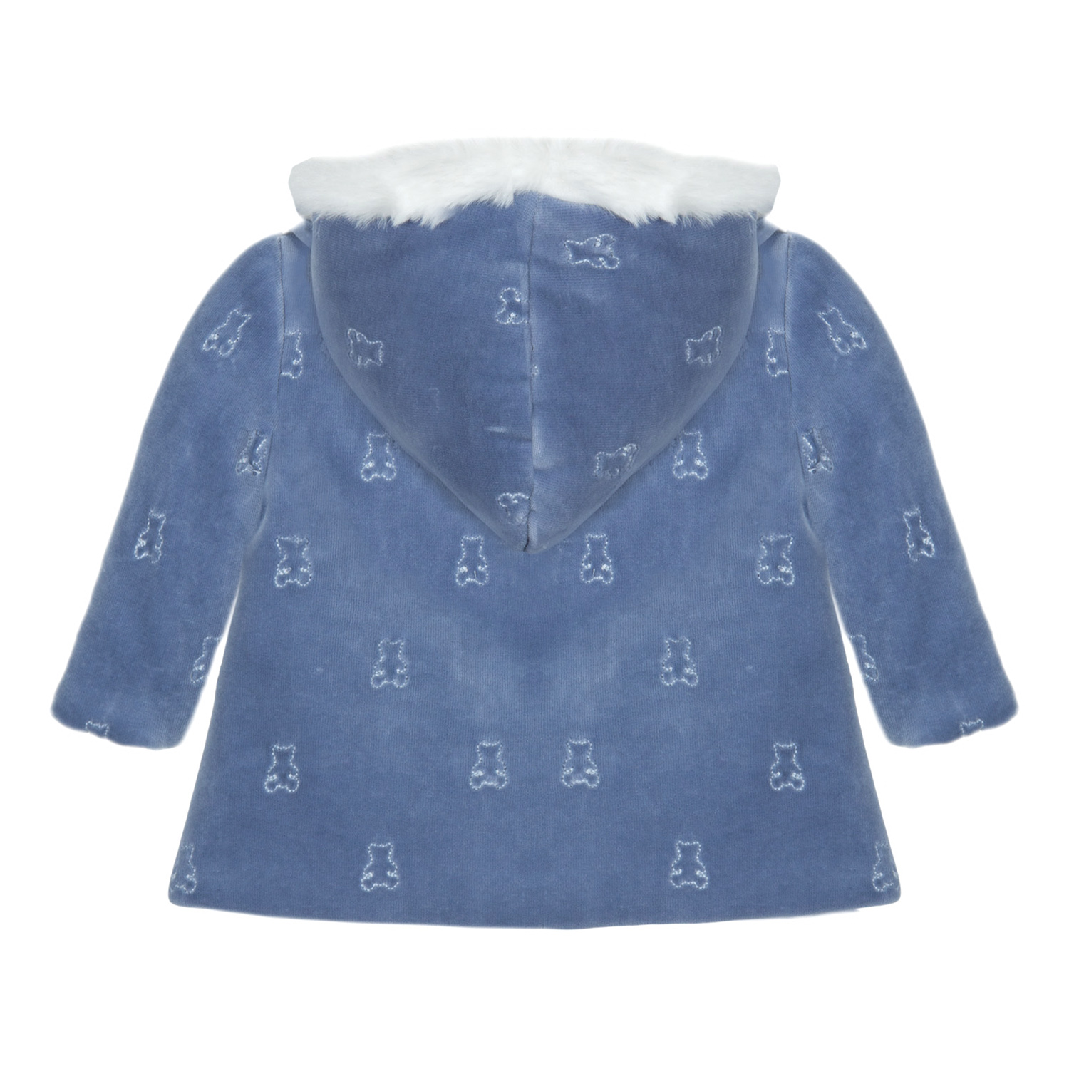 Patachou μπλε ραφ βελούδινο παλτό-λεπτό μπουφάν από οργανικό βαμβάκι, με λεπτομέρειες από αρκουδάκι, εσωτερικό μέρος στην κουκούλα από οικολογική γούνα και κλείσιμο με κουμπιά μπροστά.