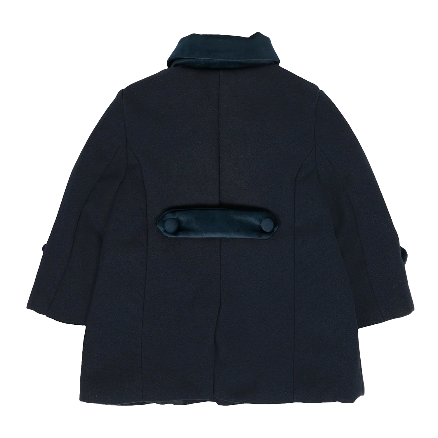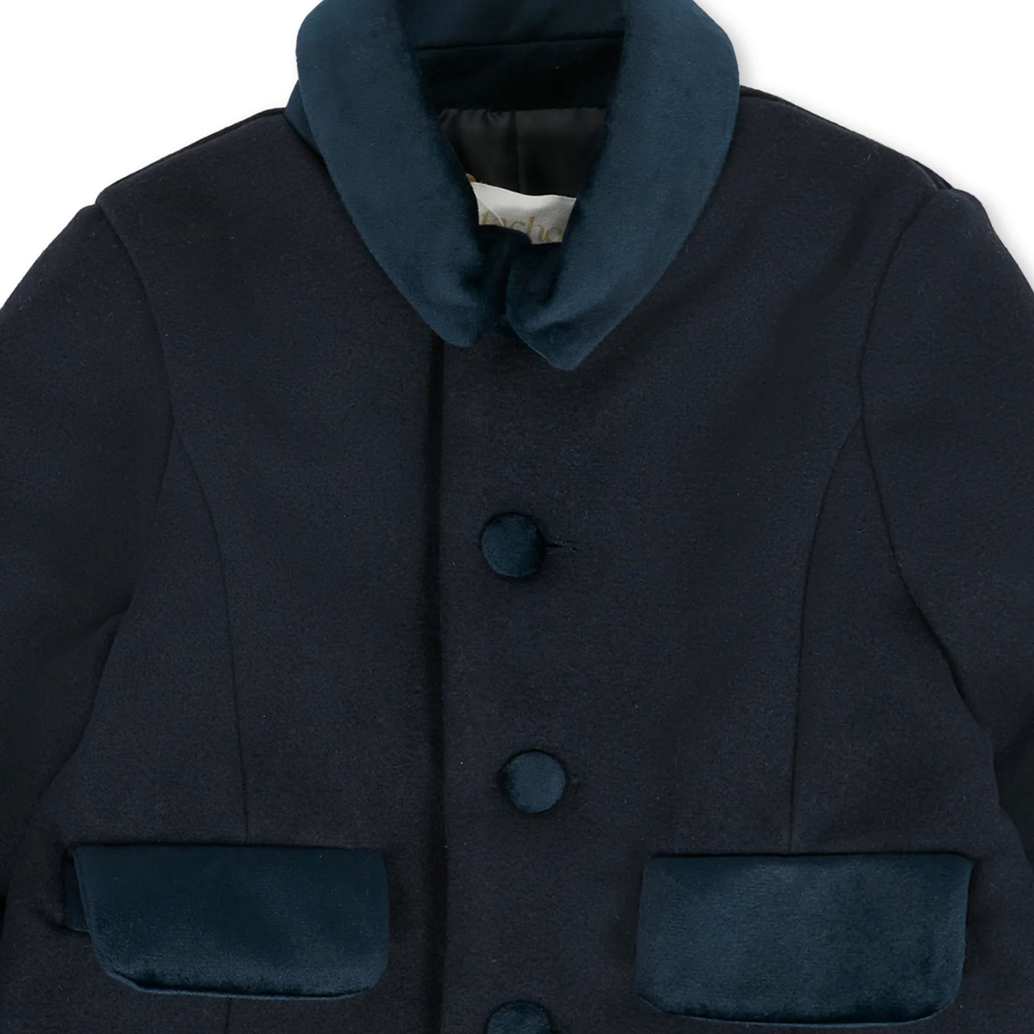Patachou σκούρο μπλε techno-wool παλτό με ασορτί σκούρες μπλε βελούρ λεπτομέρειες στον γιακά, τις τσέπες και τα κουμπιά. Εσωτερικά έχει απαλή φόδρα.