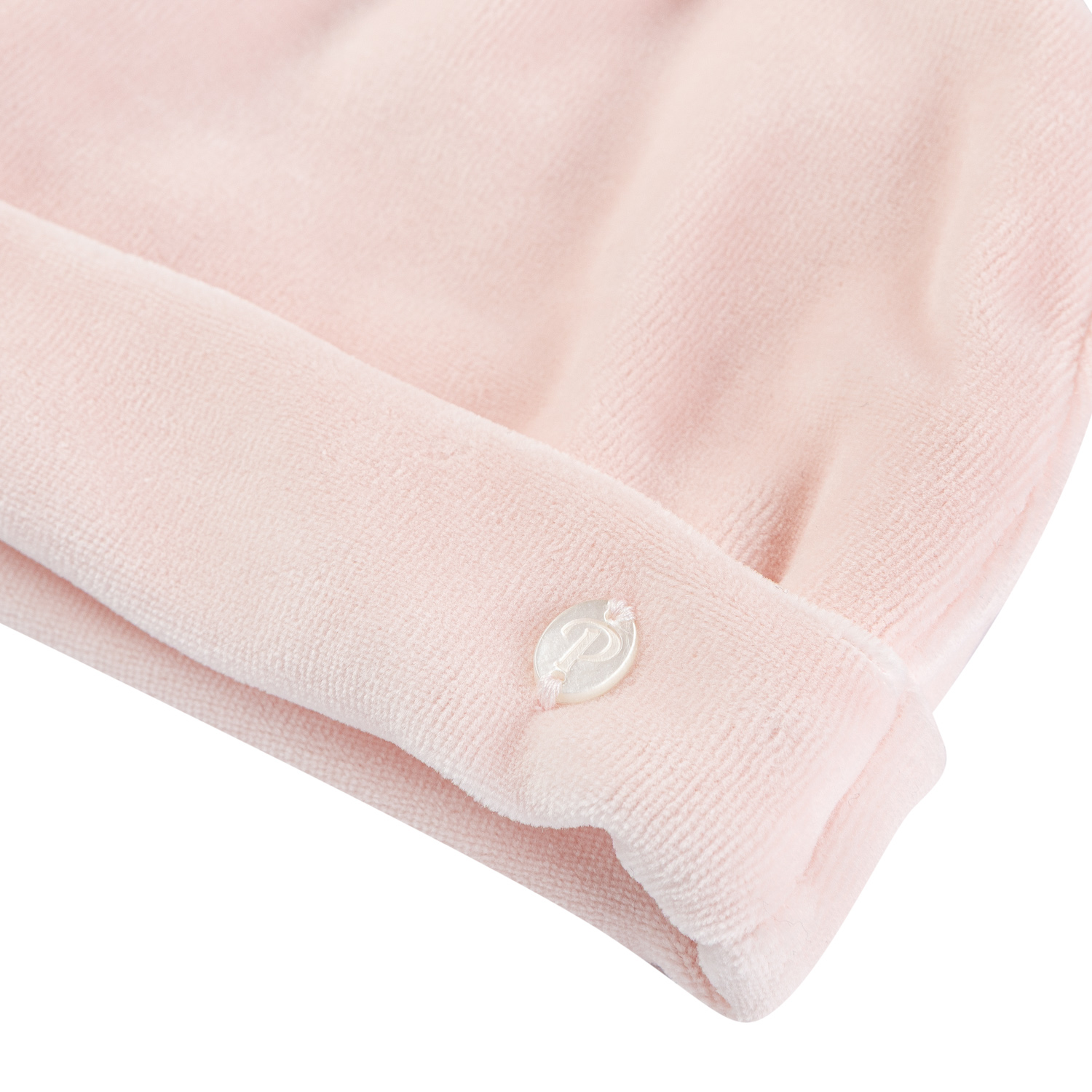 Patachou βελούδινο σκουφί από οργανικό βαμβάκι σε απαλό ροζ χρώμα με ασορτί φούντα από οικολογική γούνα.