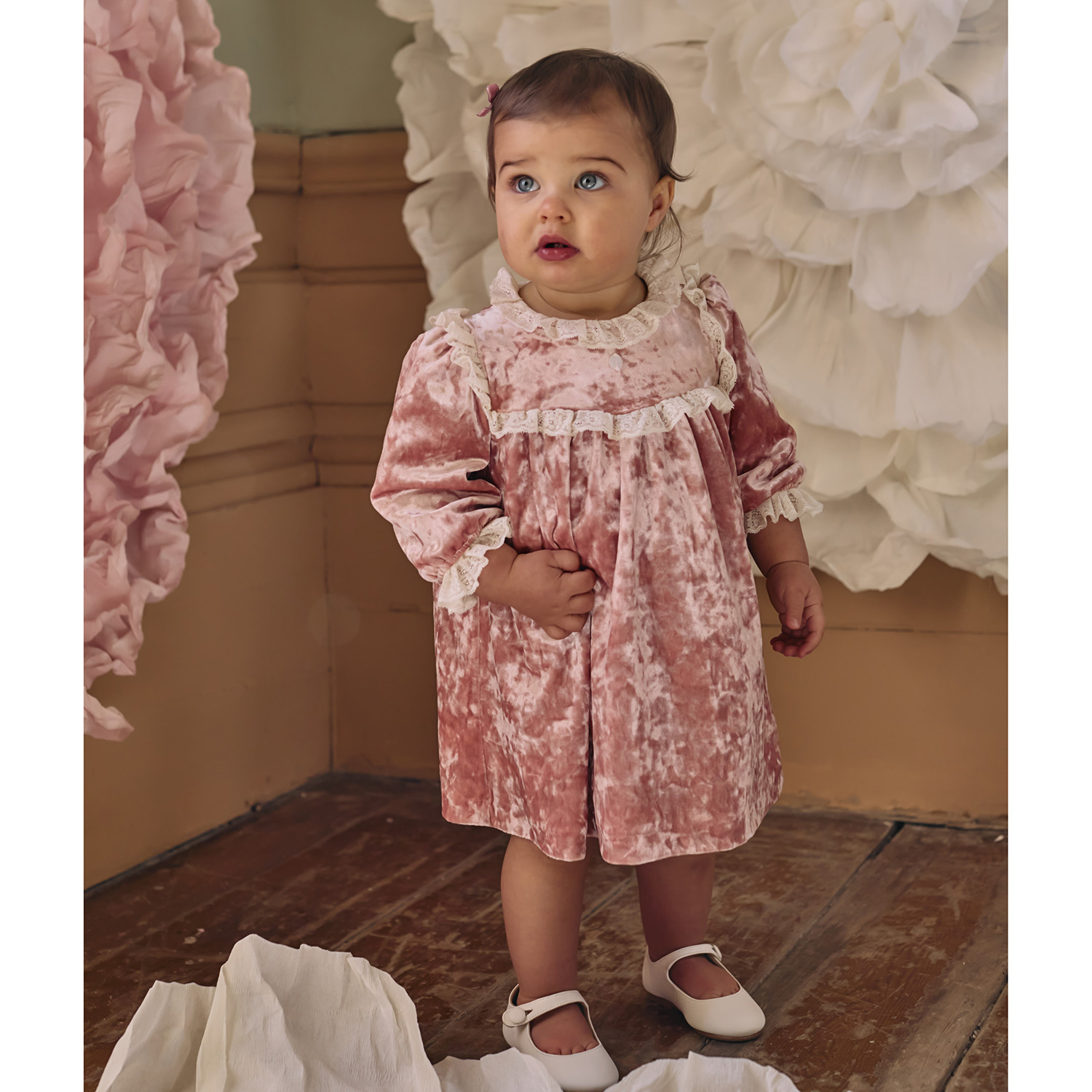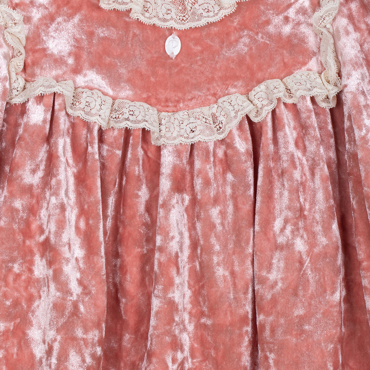 Patachou βελούδινο φόρεμα σε ροζ dusty χρώμα με λεπτομέρειες από δαντέλα κιπούρ σε ιβουάρ, απαλή φόδρα εσωτερικά και διακριτικό φερμουάρ στο πίσω μέρος.