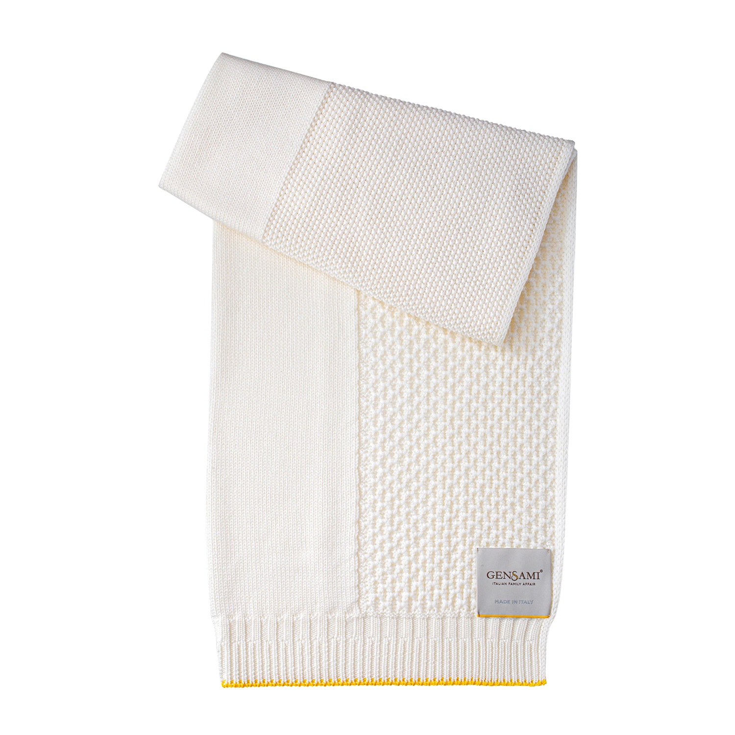 Gensami ιβουάρ πλκετό φορμάκι, κατασκευασμένο από εξαιρετικής ποιότητας οργανικό βαμβάκι με κροσέ ύφανση. Διαθέτει κούμπωμα με κουμπιά και το εμβληματικό χαρακτηριστικό σύμβολο της κίτρινης κλωστής.