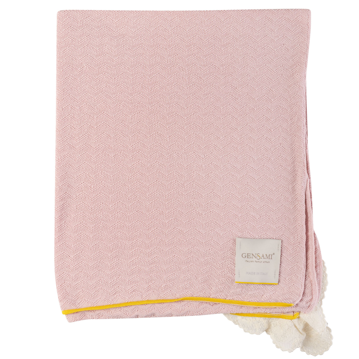 Gensami ροζ dusty πλεκτό φορμάκι με κυματιστό σχέδιο, από εξαιρετικά λεπτό μετάξι Mulberry και οργανικό βαμβάκι. Διαθέτει κλασικό κούμπωμα, λεπτομέρεια από υπόλευκη δαντέλα και το εμβληματικό χαρακτηριστικό σύμβολο της κίτρινης κλωστής.