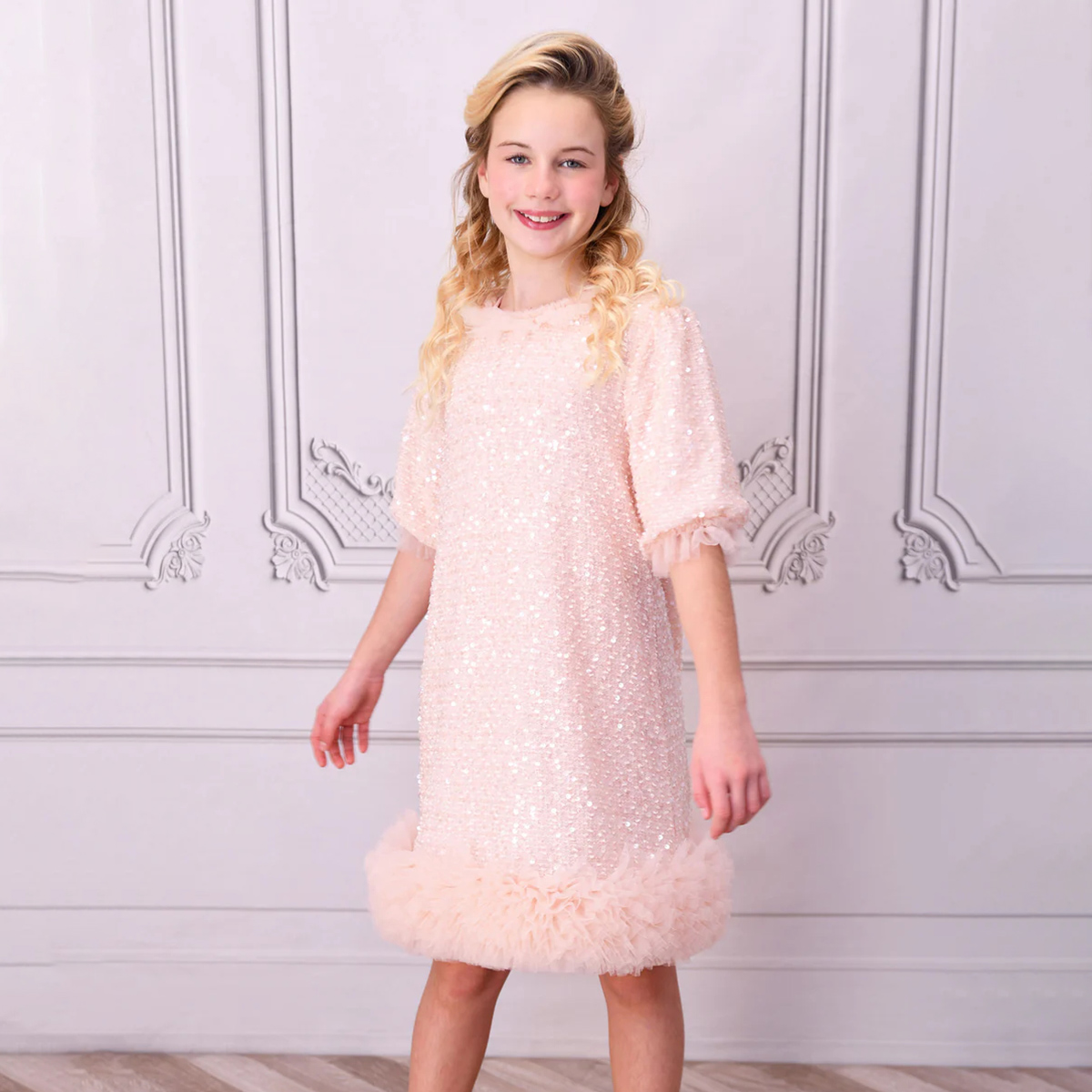 Angel s Face απαλό ροζ φόρεμα με απλικέ παγιέτες, ημίμακρα μανίκια, τούλινο βολάν στο κάτω μέρος και απαλή εσωτερική φόδρα.