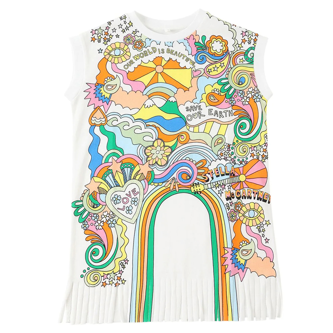 Stella McCartney λευκό βαμβακερό μπλουζάκι με πολύχρωμες στάμπες και λογότυπα, καθώς και κρόσσια στο τελείωμα.