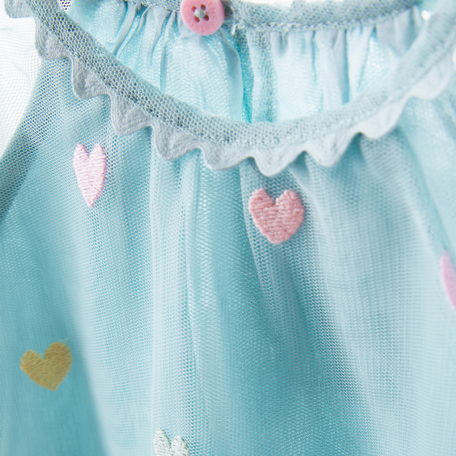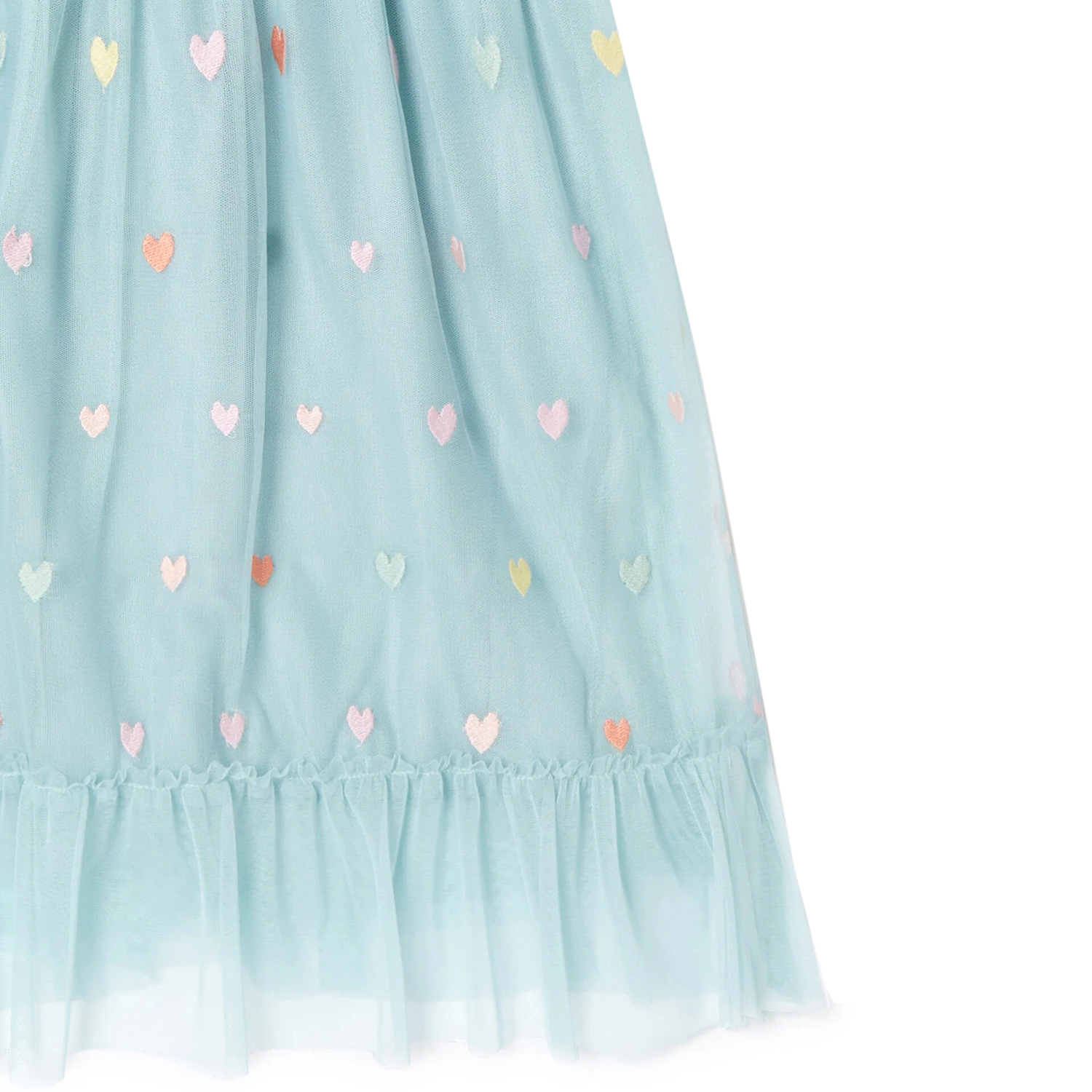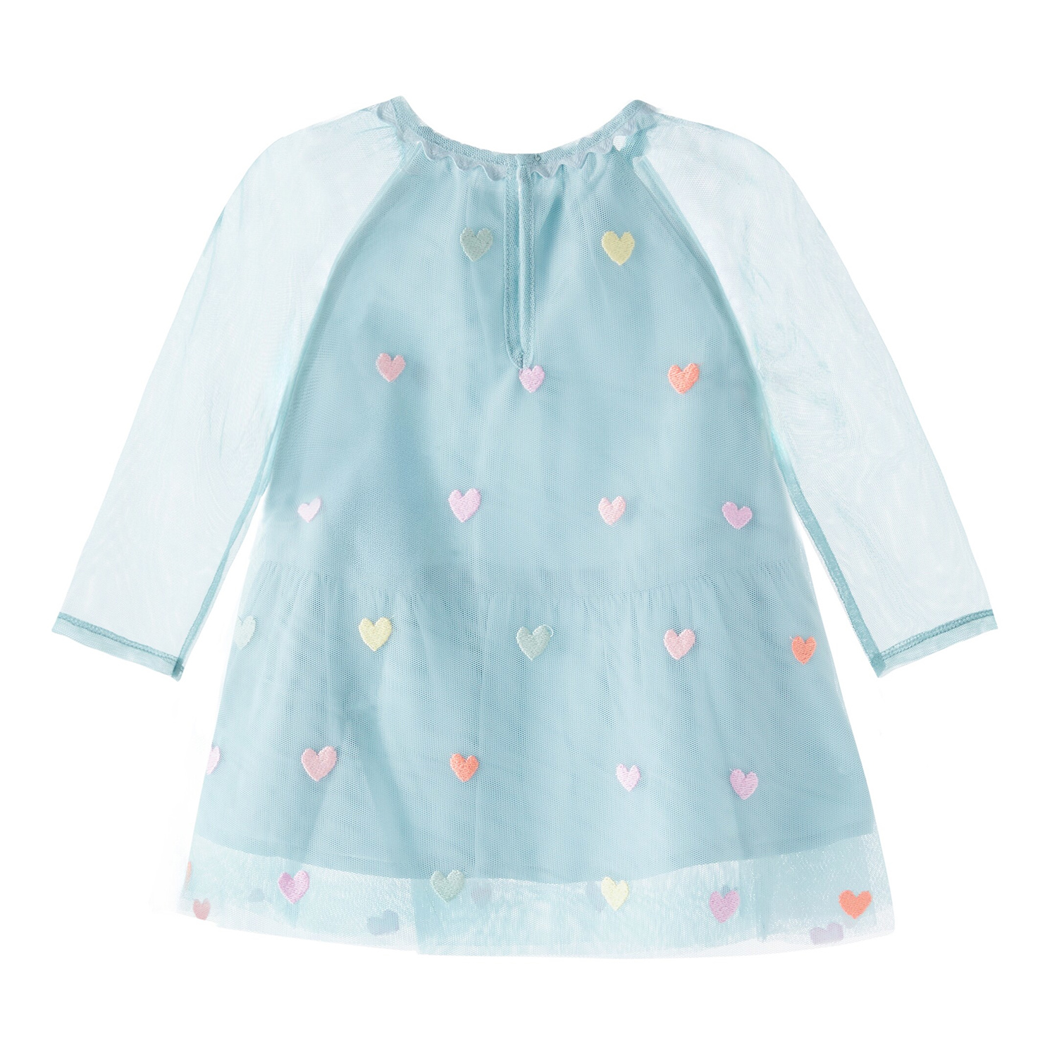 Stella McCartney βεραμάν τούλινο φόρεμα με μακριά διαφανή μανίκια και πολύχρωμες κεντημένες καρδιές. Διαθέτει απαλή εσωτερική επένδυση.