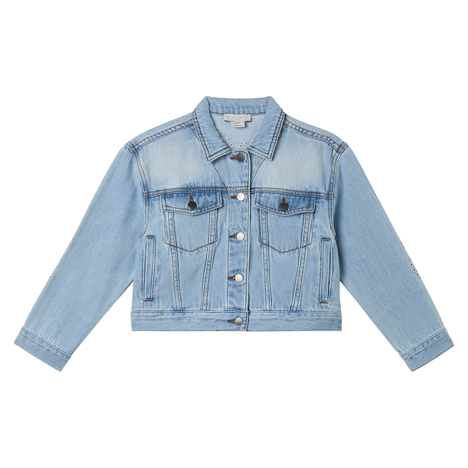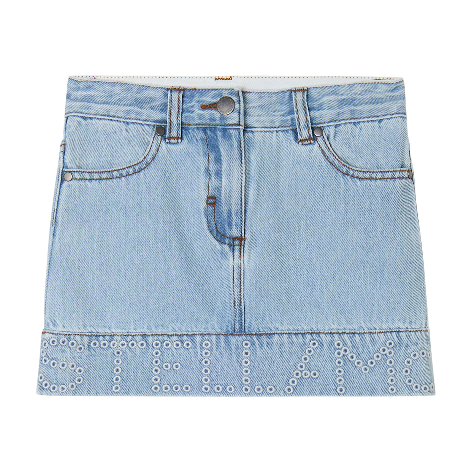 Stella McCartney ανοιχτή μπλε τζιν φούστα με διακριτικό λογότυπο περιμετρικά και ελαστικούς ρυθμιστές στο εσωτερικό της μέσης.