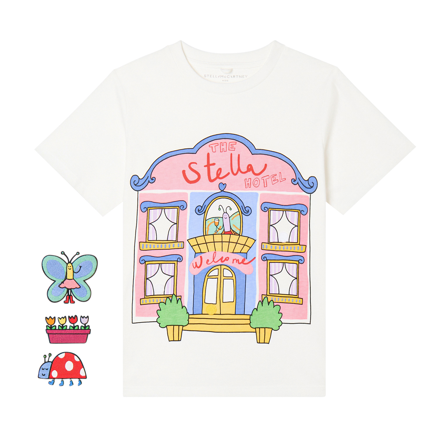 Stella McCartney υπόλευκη μπλούζα από οργανικό βαμβάκι, με τυπωμένες λεπτομέρειες και αφαιρούμενα patches.
