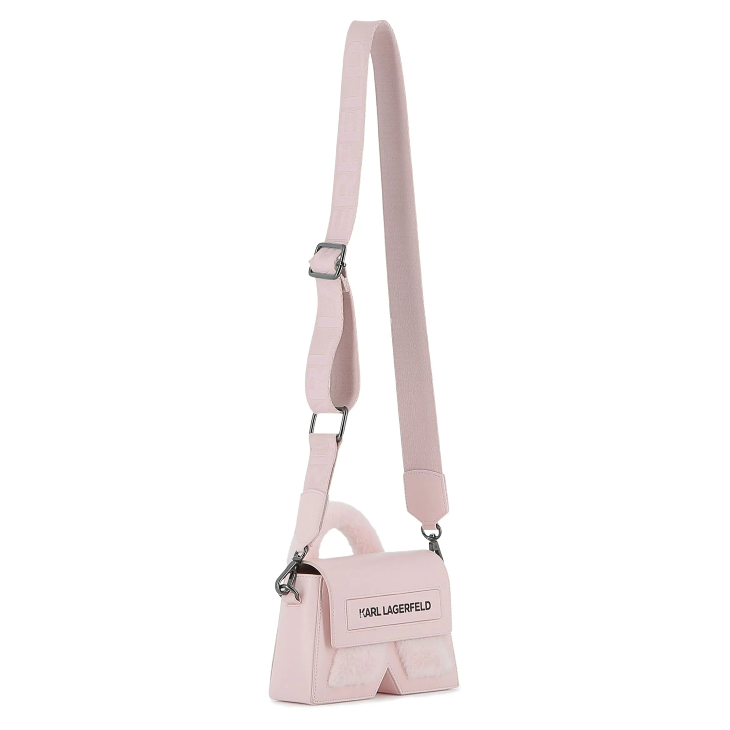 Karl Lagerfeld “IKONIK” τσάντα σε ροζ παλ χρώμα, σε στιλ Κ, με οικολογικές γούνινες λεπτομέρειες. Διαθέτει μαγνητικό κούμπωμα, λουράκι ώμου με λογότυπο και λαβή από οικολογική γούνα.