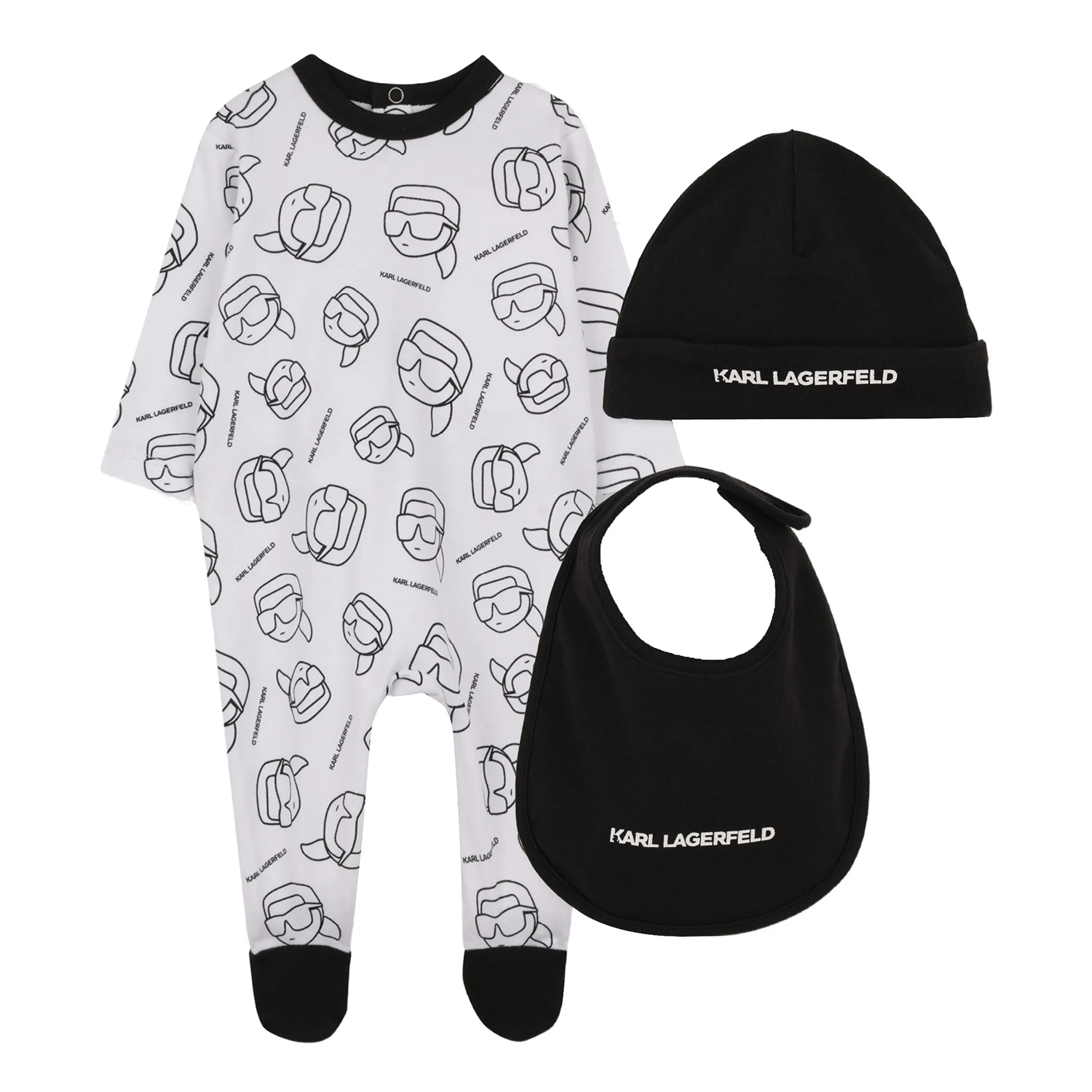 Karl Lagerfeld μαύρο και λευκό βρεεφικό σετ από οργανικό βαμβάκι, που περιλαμβάνει φορμάκι με τυπωμένες φιγούρες Karl, ασορτί σκουφάκι και σαλιάρα με τυπωμένες λεπτομέρειες. Το φορμάκι έχει κουμπιά. Περιλαμβάνεται κουτί δώρου.